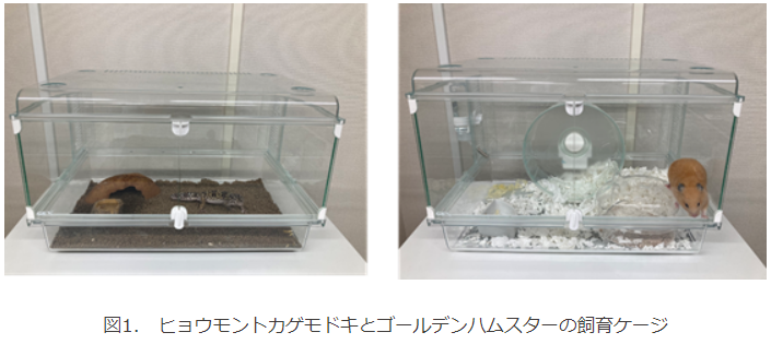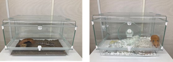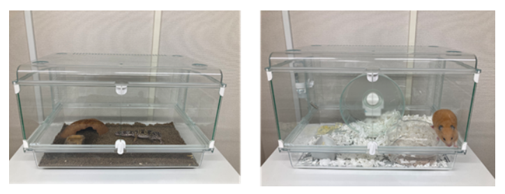 図1、ヒョウモントカゲモドキ(左)とゴールデンハムスター(右) の飼育ケージ