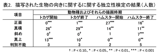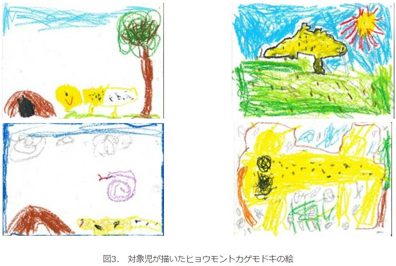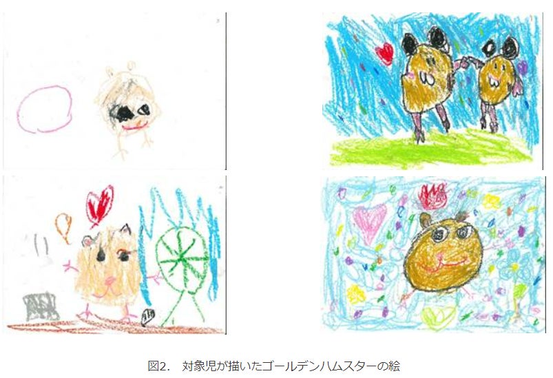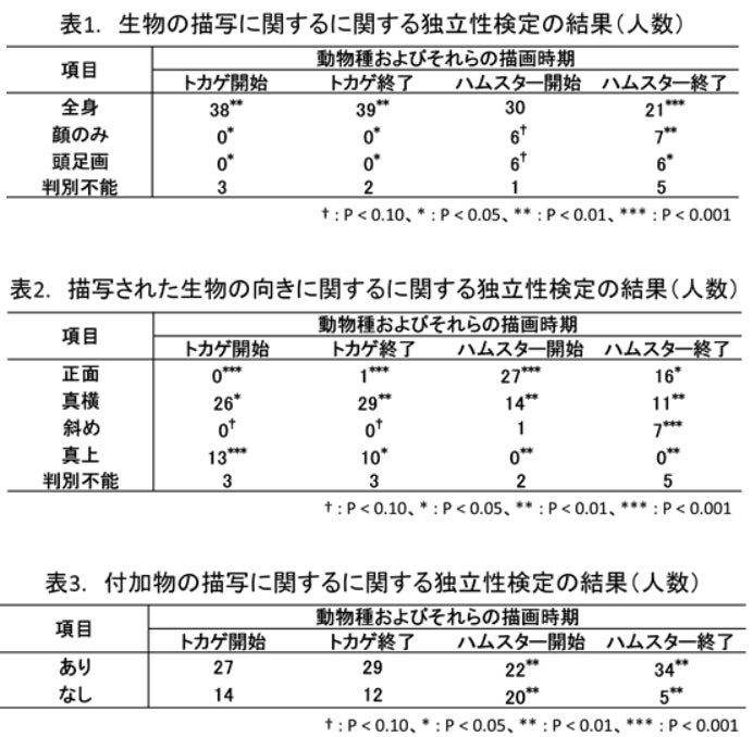 その結果、小動物の場合のみ、顔だけ及び頭足画を描いている絵が有意に多かった点。爬虫類の絵は、飾り(飼育用品)やケージを表現する絵が、小動物の絵では付加物(ハートや虹、文字など)を描く絵が有意に多かった点などが明らかになりました。これらのことから、幼児は爬虫類を観察するなど科学的な対象として、小動物は「かわいい」などの情緒的な対象として、捉えている可能性が伺えました。