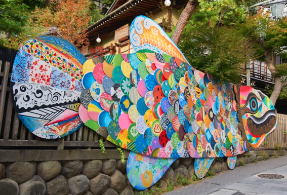 長野県渋温泉で行われたインスタレーション。ウロコ部分を地元住民に自由にペイントしてもらい、バランスを見ながら配置。頭部や細部はアーティストがペイント。野外に3ヶ月展示。
