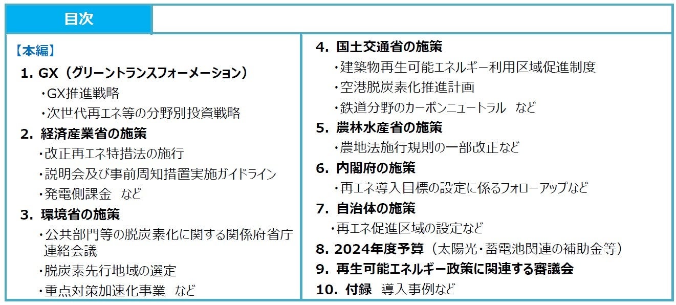 太陽光発電に関連する政策の要点や各省庁・自治体の取り組みをまとめ、事業戦略策定や政策対応に必要なGX(グリーントランスフォーメーション)や2024年度予算などを含めた情報を提供するレポート
