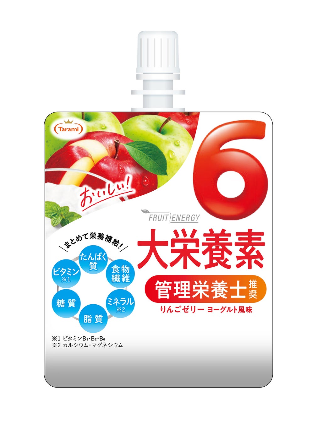 「FRUIT ENERGY 6大栄養素 りんごゼリーヨーグルト風味」は、人間の身体に欠くことのできない6大栄養素(たんぱく質・糖質・脂質・ビタミン(※1) ・ミネラル(※2) ・食物繊維)を一度に摂ることが できる、管理栄養士推奨(※3)のパウチゼリーです。