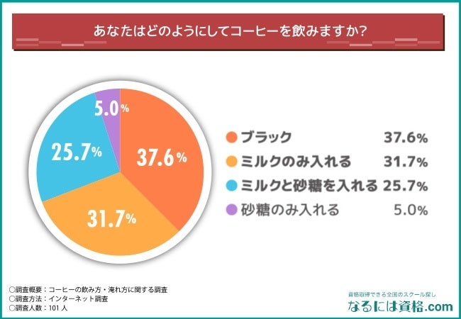 なるには資格.com(株式会社Nanea 本社:福岡県、代表取締役:石丸大輔)は、全国20代〜60代の男女101名を対象に、「コーヒーの飲み方・淹れ方」に関する調査を実施しました。