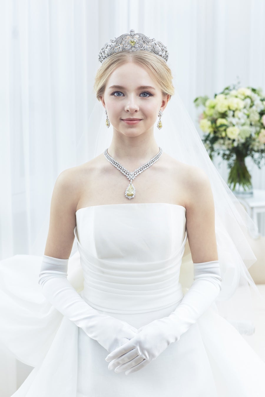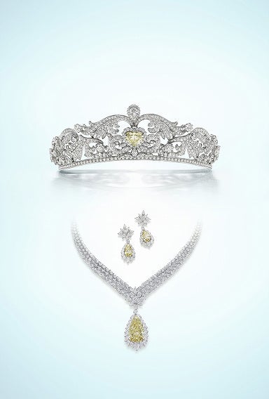 ティアラとネックレスの中心には、希少性の高い大粒イエローダイヤモンドがセットされており、その輝きはまさに圧巻です。