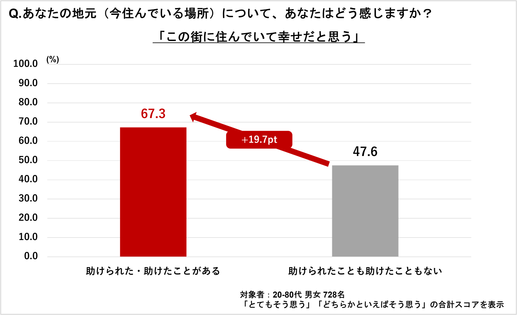 「Q3. あなたの地元(今住んでいる場所)について、あなたはどう感じますか?」(n=728)と質問したところ、「この街に住んでいて幸せだと思う」という項目に対して、「とてもそう思う」「どちらかといえばそう思う」と回答した割合は、近隣住民に助けられた/助けたことがある人は67.3%でした。助けられたことも助けたこともない人の47.6%と比べ、19.7ポイント高い結果となりました。
