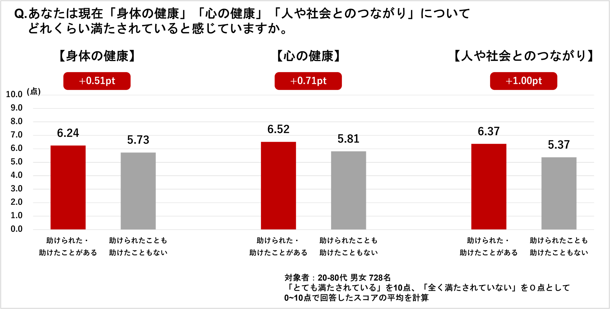 また、「身体の健康」が6.24点(経験なしと比べて0.51点増)、「心の健康」が6.52点(経験なしと比べて0.71点増)となり、助けられた/助けた経験がある人は、心身の健康の満足度も高いことがわかりました。