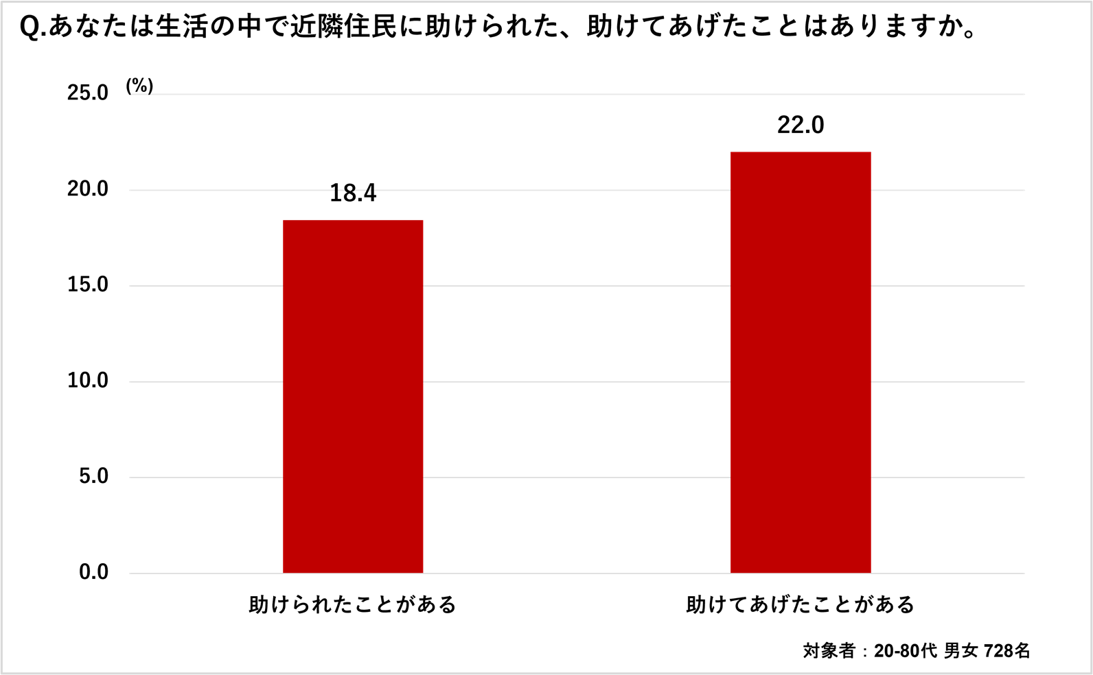 「Q2. あなたは生活の中で近隣住民に助けられた、助けてあげたことはありますか」(n=728)と質問したところ、「助けられたことがある」人は18.4%、「助けてあげたことがある」人は22.0%でした。