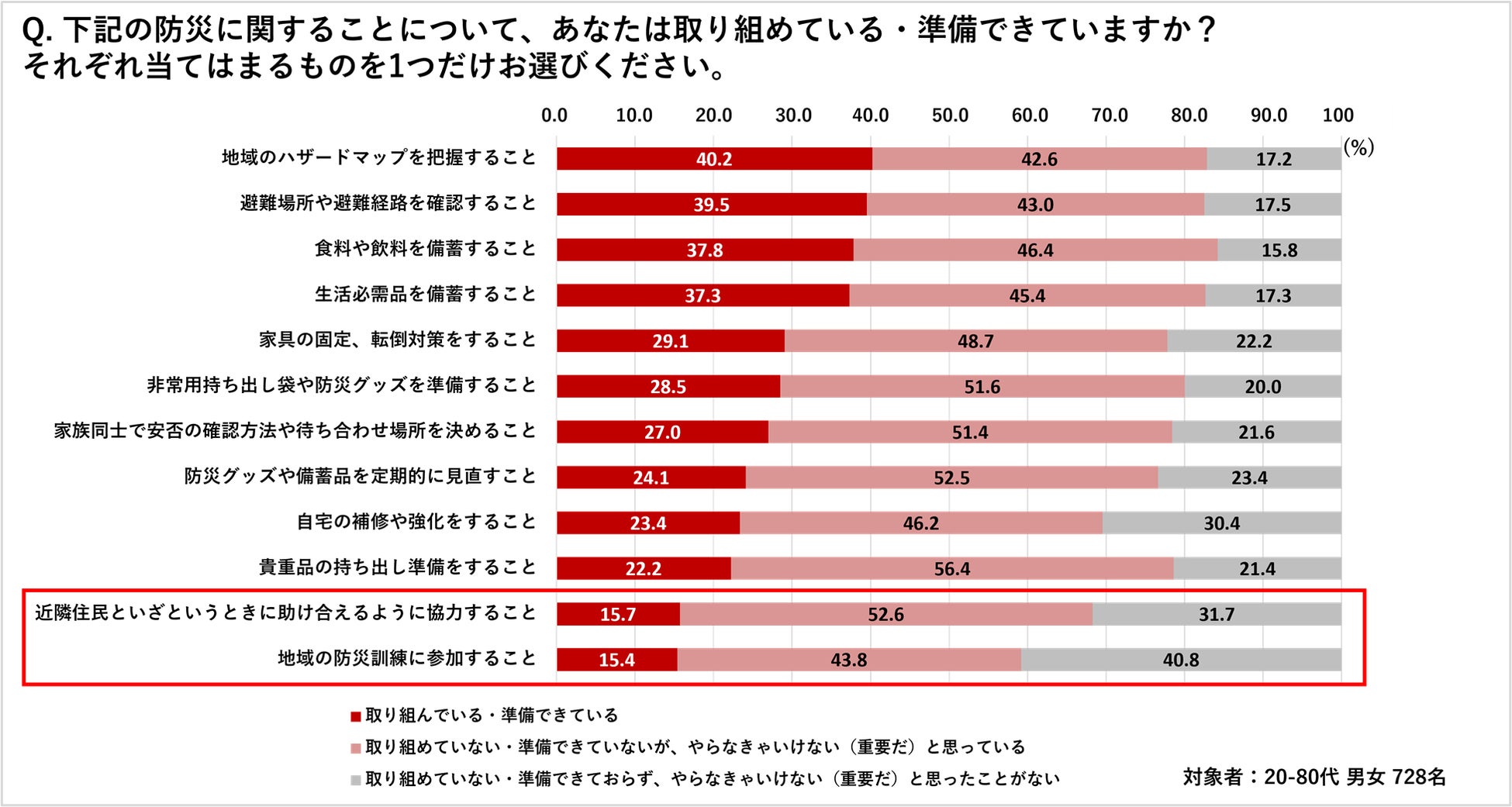 「Q1. 防災に関することについて、あなたは取り組めている・準備できていますか?」(n=728)と質問したところ、「取り組んでいる・準備できている」と回答したのは、「近隣住民といざというときに助け合えるように協力すること」が15.7%、「地域の防災訓練に参加すること」が15.4%となり、地域の助け合いを示す項目はどちらも1割台にとどまりました。