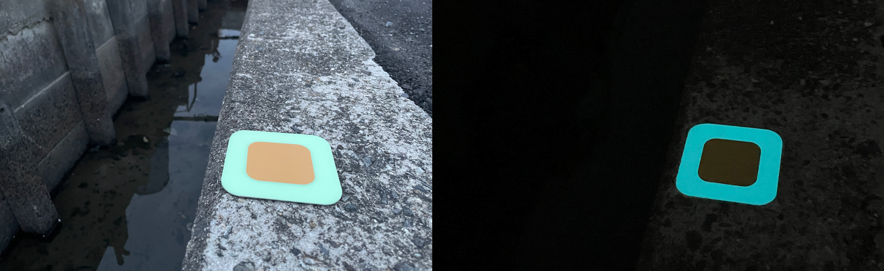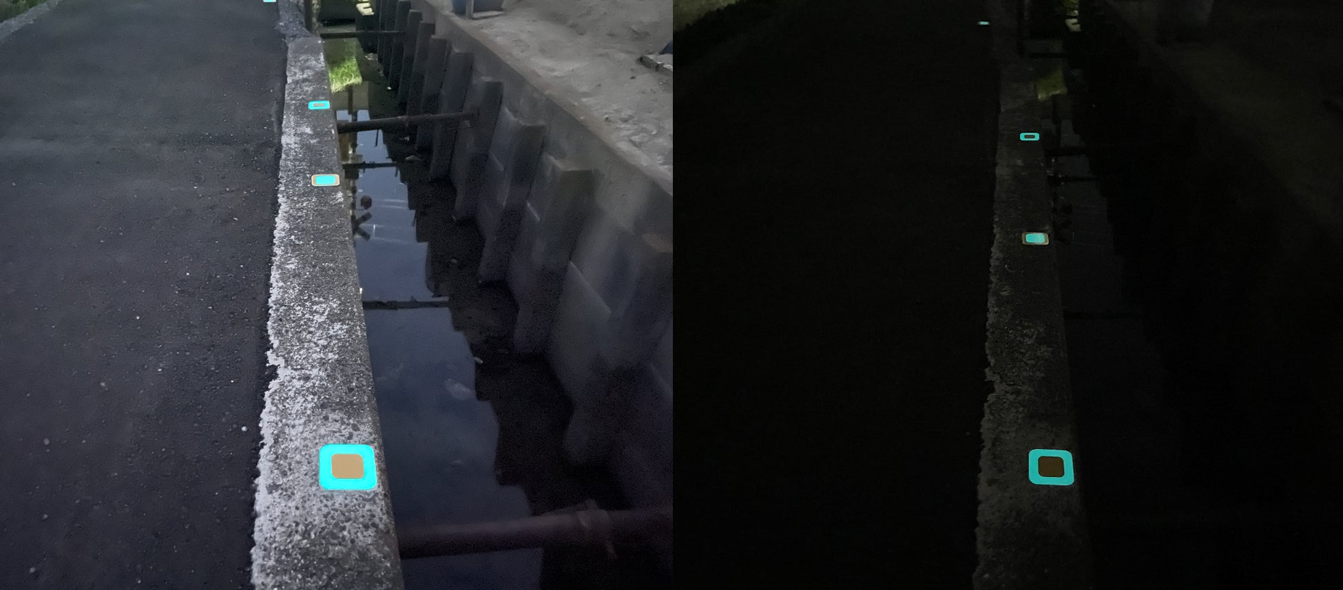ユーモラス社のナイトコンシェルジュ® は、歩行者が暗闇でも安全に通行できるエスコート目的で開発された高輝度蓄光ツールです。昼間と夜間、および自転車や自動車の夜間通行時も用水路の存在を知らしめるように、落下対策用に改良する工夫ができるのでは、という声が岡山エリアでの状況を知った開発チーム内で上がり、岡山市の賛同を得て、今回の資材提供ならびに試験運用が実現しました。