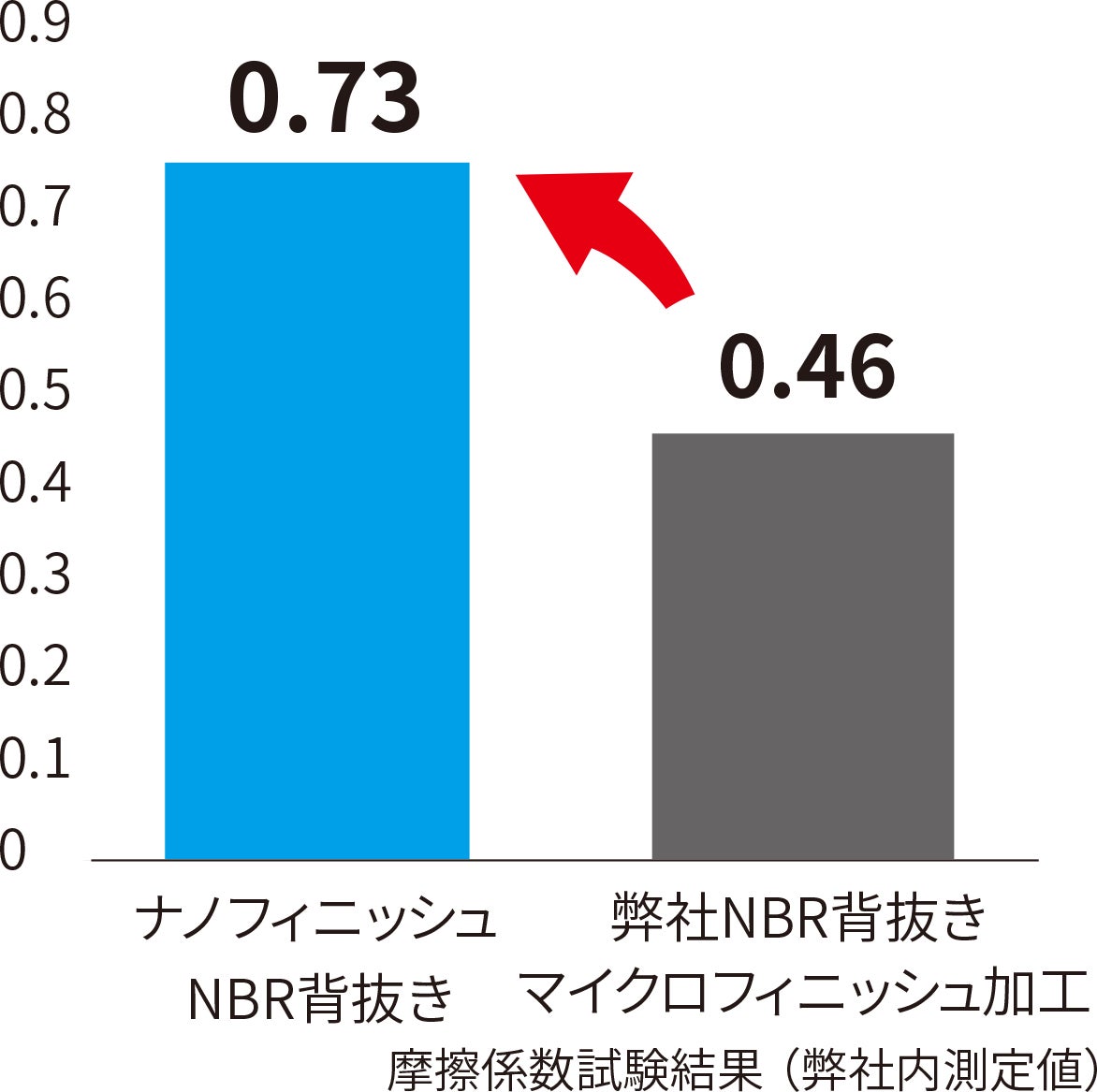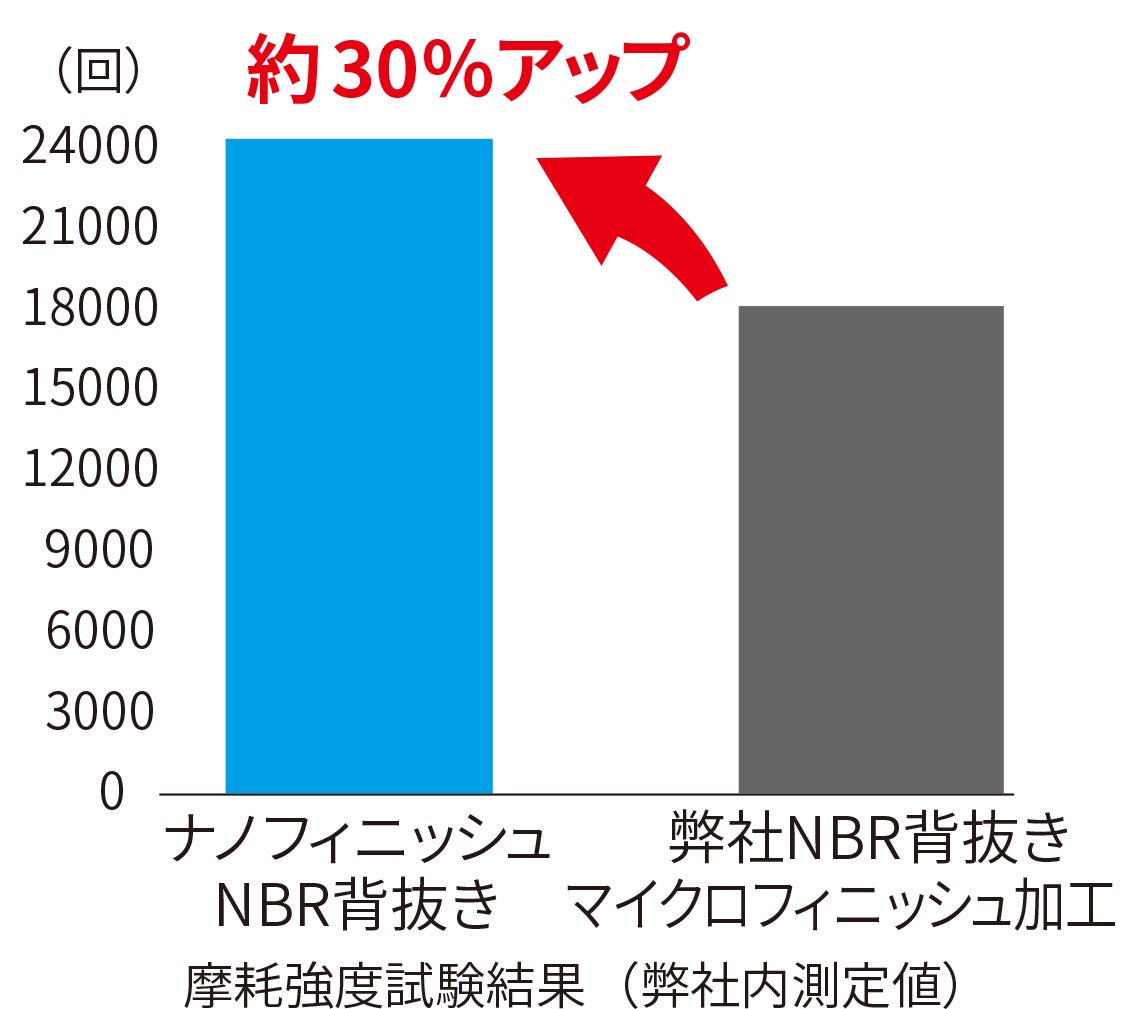 平面を保っている形状の「ナノフィニッシュ」は、擦ってもゴムが削れにくいため、磨耗強度は弊社従来品と比較して約30%アップしました。