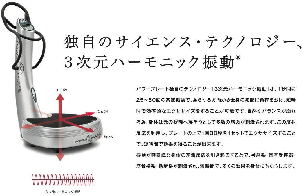 Power Plate独自のテクノロジー「3次元ハーモニック振動」は、1秒間に25〜50回の高速振動で、あらゆる方向から全身の細部に負荷をかけ、短時間で効率的なエクササイズをすることが可能です。自然なバランスが崩れるため、身体は元の状態に戻そうとして多数の筋肉が刺激されます。この反射反応を利用し、プレートの上で1回30秒を1セットでエクササイズすることで、短時間で効果を得ることが出来ます。