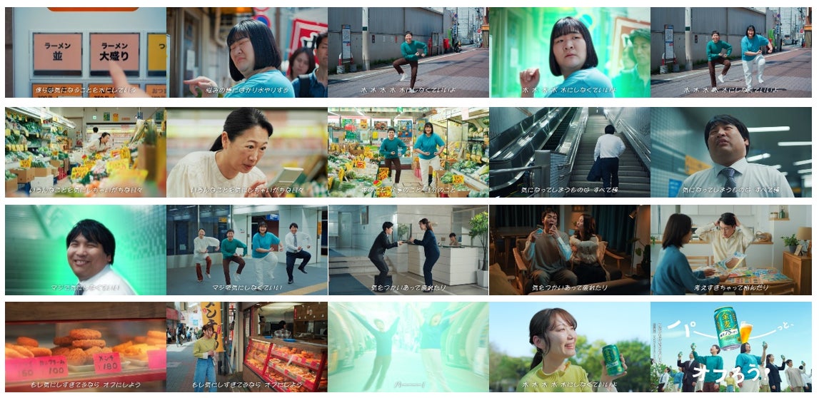 ラーメン屋の券売機の前で並盛りか大盛りかで悩んだり、駅でエスカレーターを使うか階段を使うか悩んだり、肉屋で揚げ物を買うか迷ったり、いつもついつい身体のことを考えて普段の行動まで気にし過ぎてしまう人たち。そんな気にし過ぎてしまう人たちにヨネダ2000が、考えすぎると疲れるから考えるのは“オフ”にしよう、と呼びかけていきます。最後は、ヨネダ2000と気にし過ぎてしまう人たちが「金麦〈糖質75%オフ〉」を飲んですっきりしている映像で、糖質を“気にしなくてもいい”商品価値を伝えます。