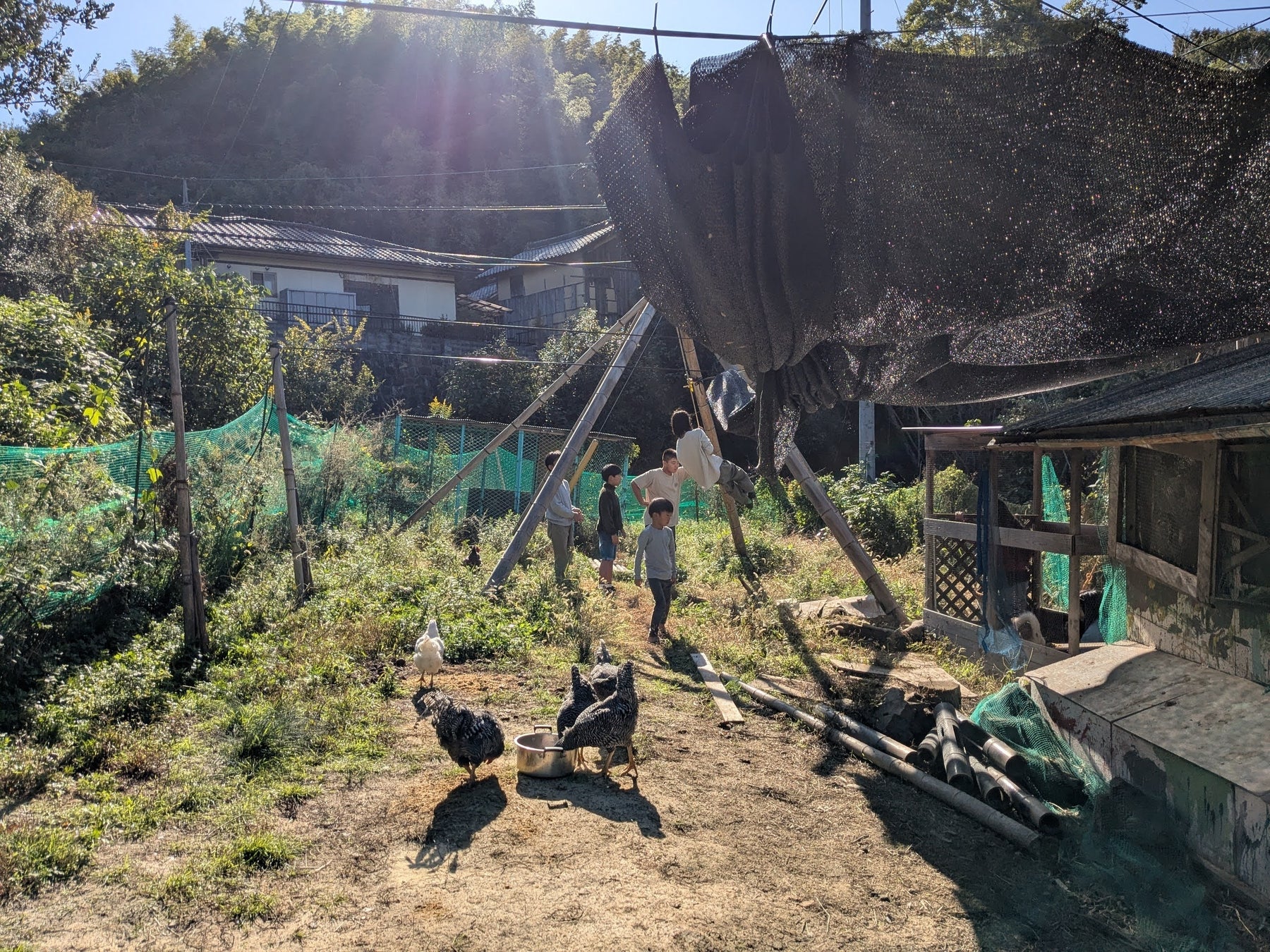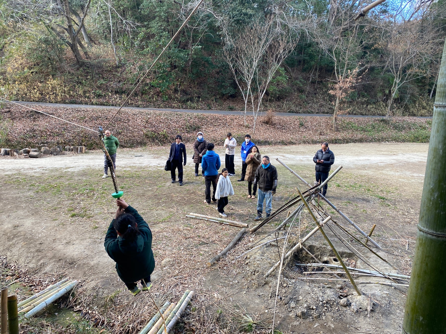 成果報告の後は、母屋・鶏小屋・自由な遊び場「スコパ」・田んぼを巡るフィールド見学を行いました。この時間は、スコレーに通う子どもたちが案内役となり、鶏の抱っこの仕方を教えてくれたり、ターザンロープで遊ぶ際には、落ち葉を集めて安全な「ベッド」を作ってくれたりと、大人を気遣う姿が随所に見られました。