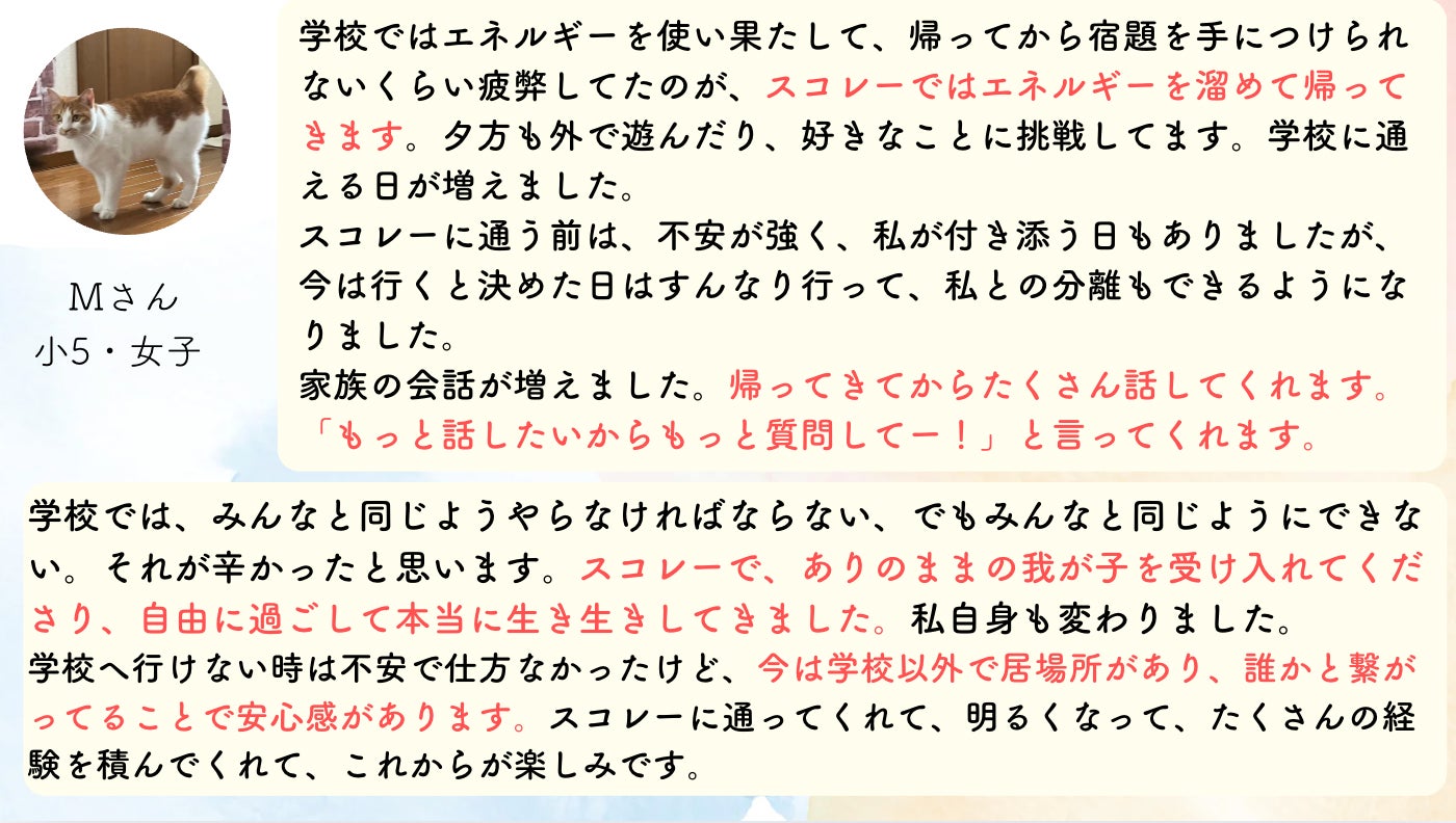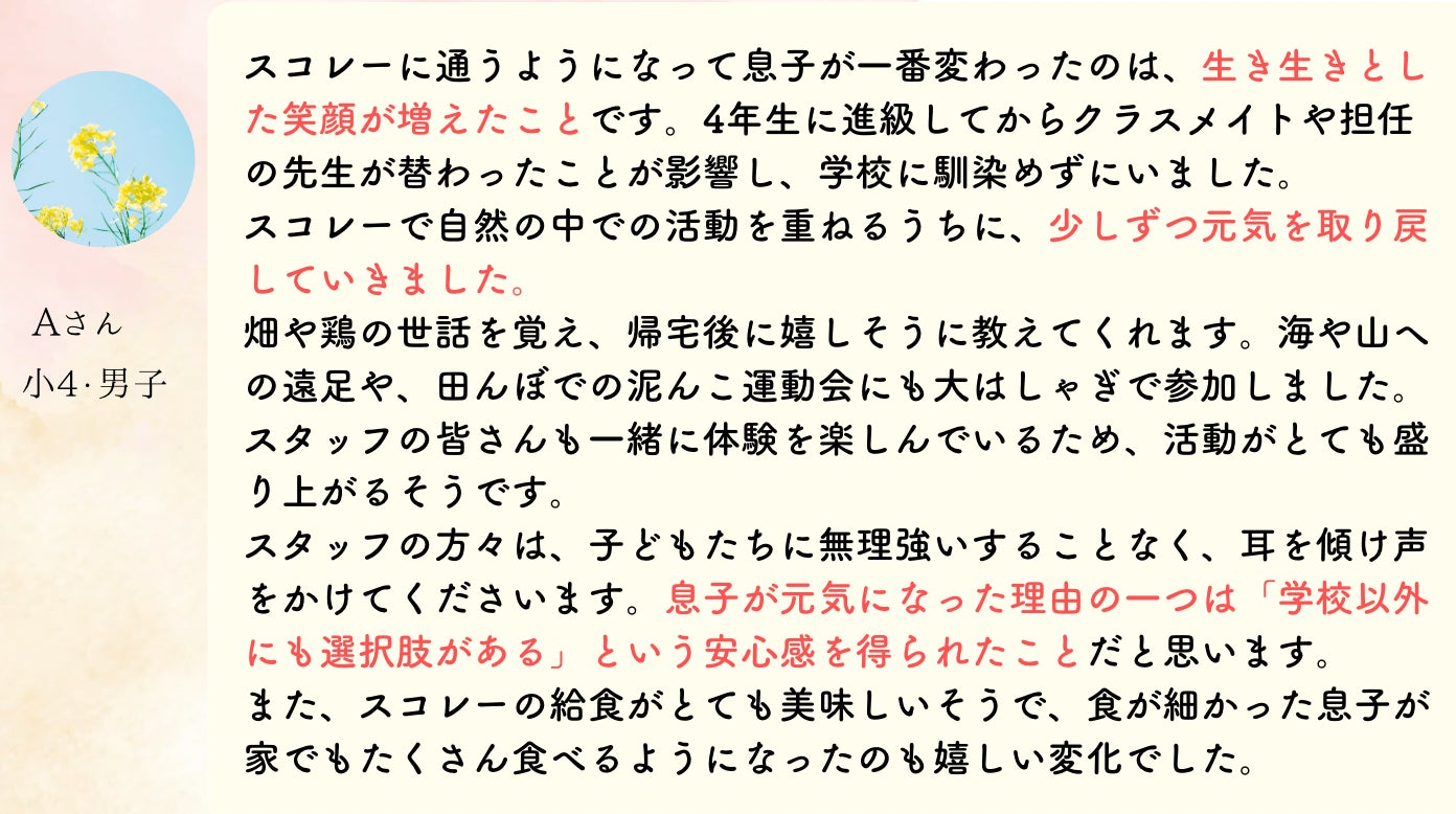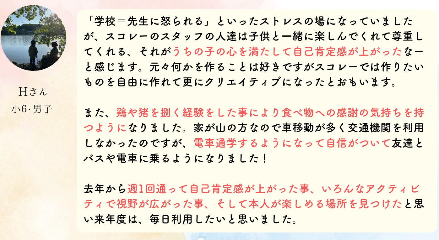 「前は、学校での出来事を聞いても全く話してくれなかった。スコレーに行ってから、帰りの車でおしゃべりがとまらない」