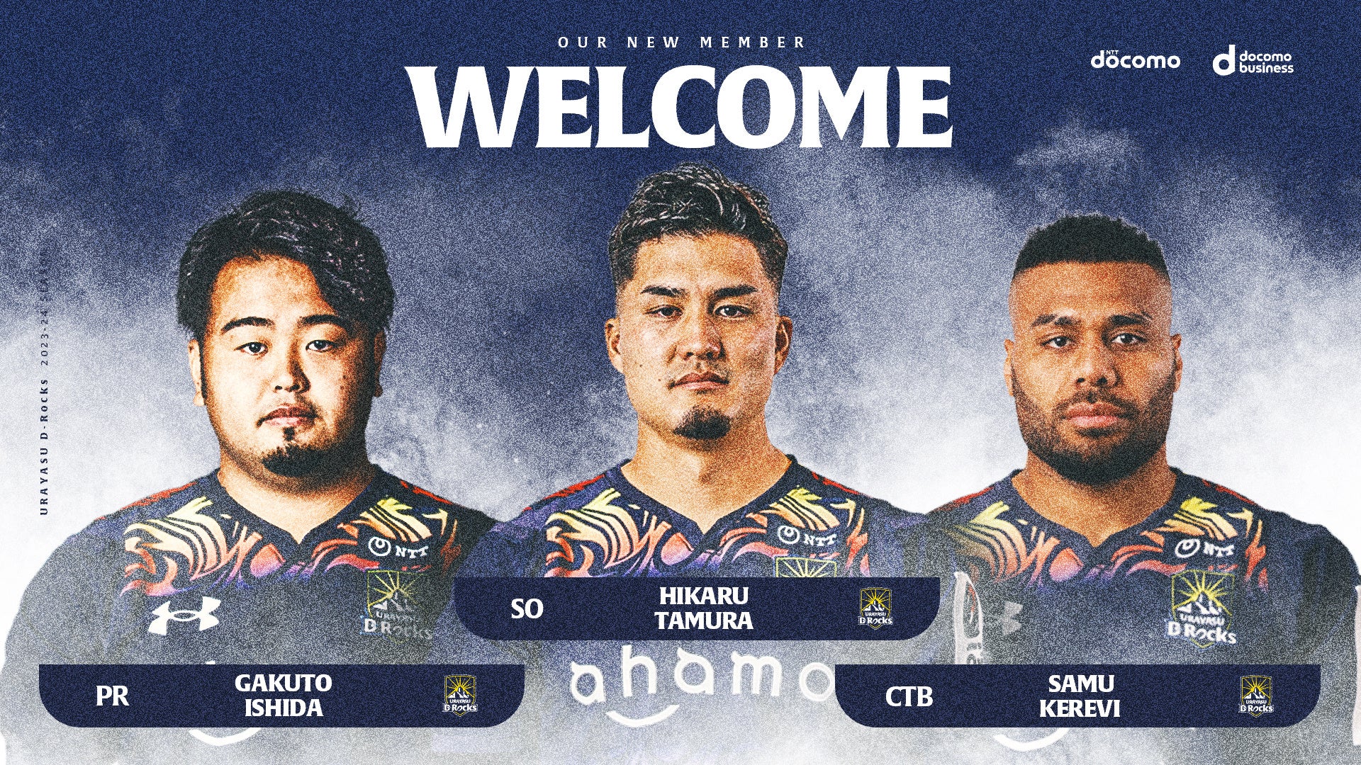 こんにちはD-Rocksの家族の皆さん。まず、D-Rocksのマネージメントスタッフに日本でラグビーを続ける機会を頂いた事に感謝しています。この新しい道をとっても楽しみにしています。D-Rocksに入って、みんなとラグビーできること、そしてファンの皆様と会える事を楽しみにしています。