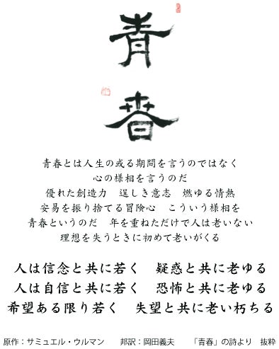 “⻘春とは⼈⽣の或る時期を⾔うのでなく、⼼の様相を⾔うのだ”の⼀⽂で始まる、サミュエル・ウルマン原作の『⻘春』の詩。
