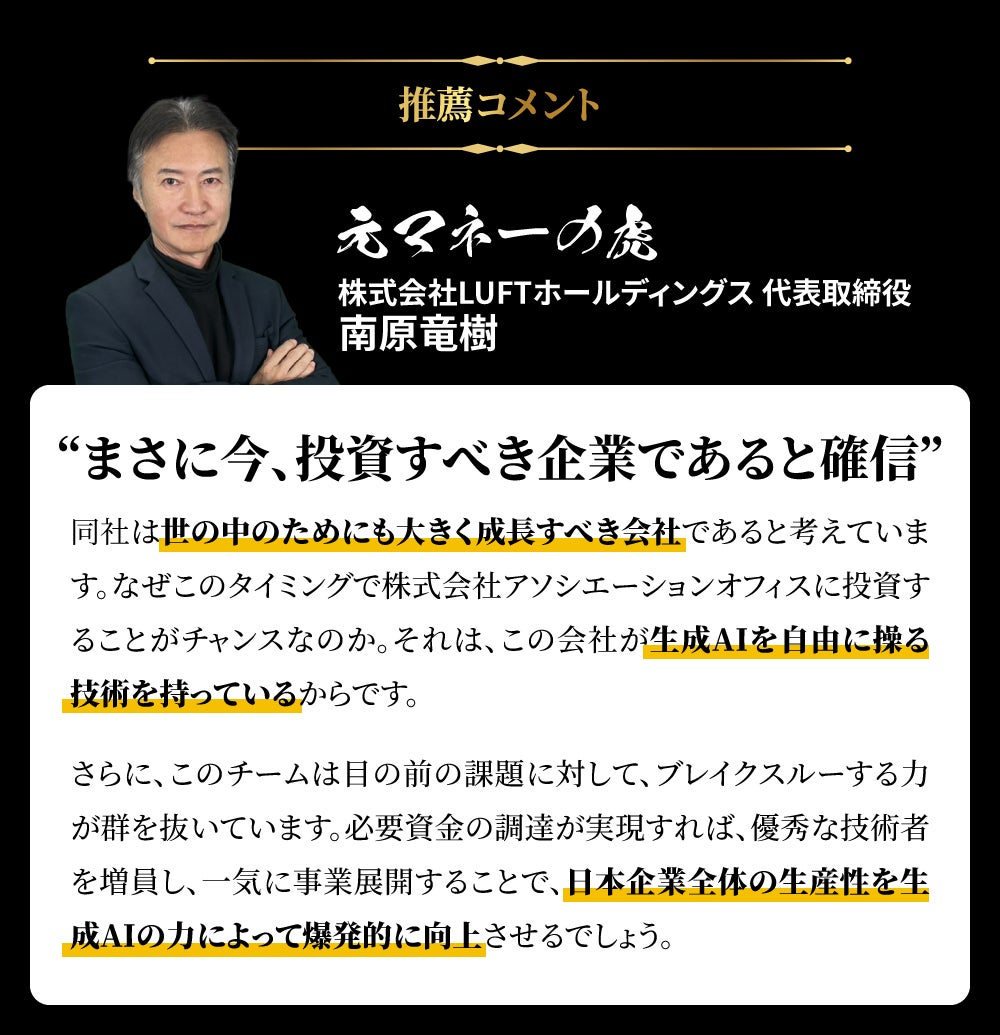 元「マネーの虎」で知られる実業家・南原竜樹氏は、泉代表のビジネスに対して「単なるAI技術開発企業ではなく、生成AIを産業変革の核とする事業実装力を持つ希少な存在」と絶賛。