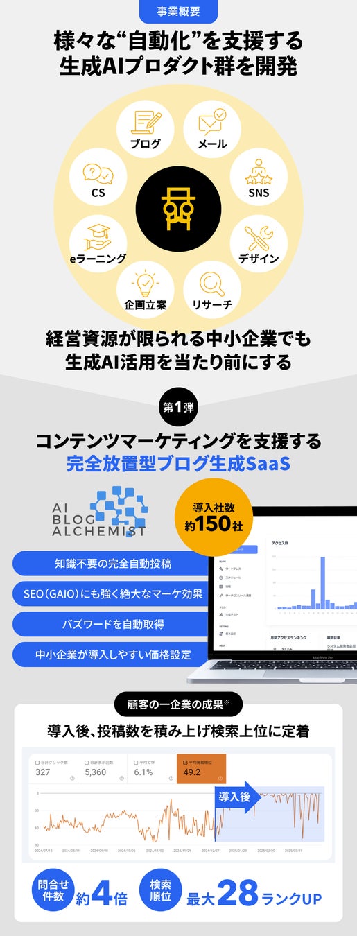 本プロジェクトでは、生成AIによる完全自動マーケティングツール「AIブログアルケミスト」のさらなる拡大と、新たな生成AIプロダクト群の展開に向けた成長資金を募集しています。