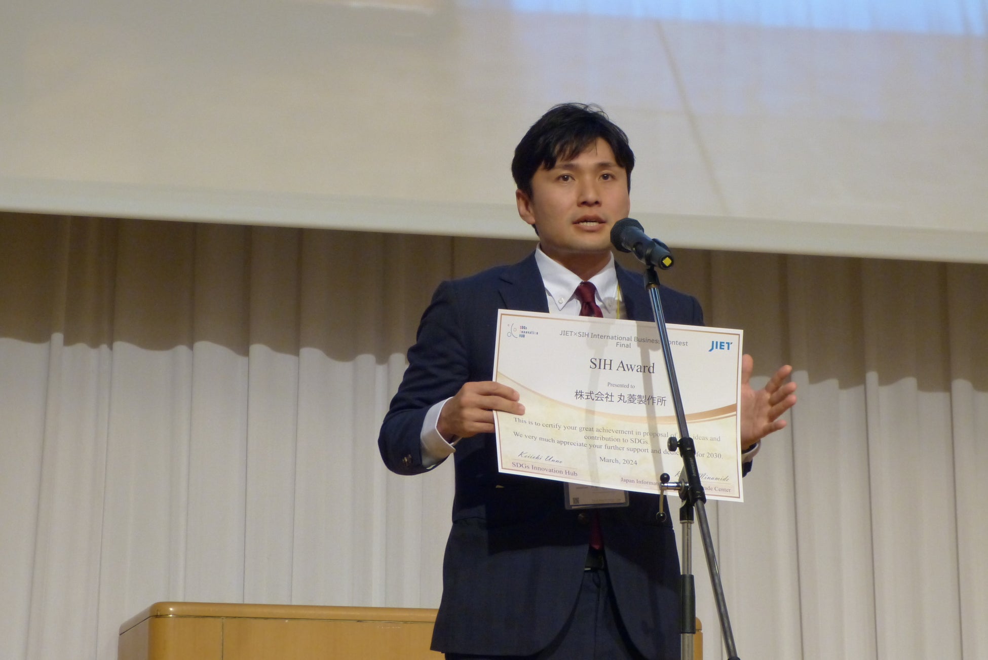 このたび、株式会社丸菱製作所(本社:愛知県春日井市、専務取締役:戸松 裕登、以下 丸菱製作所)が、JIET主催の「第一回JIET×SIH国際ビジネスコンテスト」に出場し、「SIH賞」を受賞したことをお知らせいたします。2024年3月15日(金)には、「JIET EXPO in 九州・宮崎」内で実施された同ビジネスコンテストの表彰式に参加いたしました。
