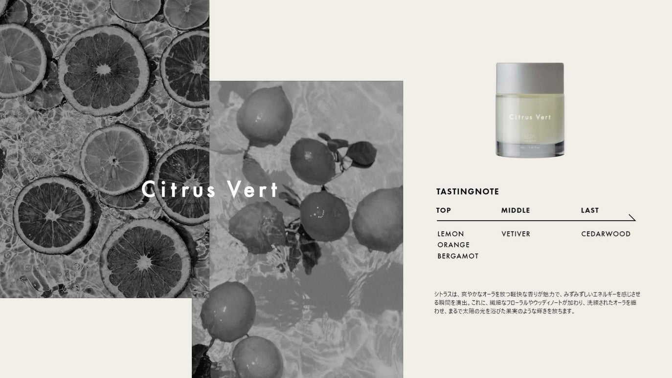 ベルガモットやレモンのシトラスが明るく引き立てます。