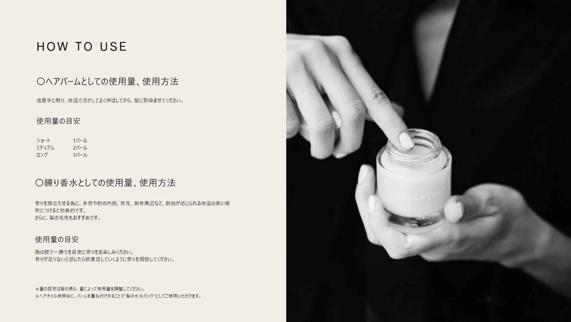 ※ヘアオイル使用後に、バームを重ね付けすることで”髪の水分パック”としてご使用いただけます。