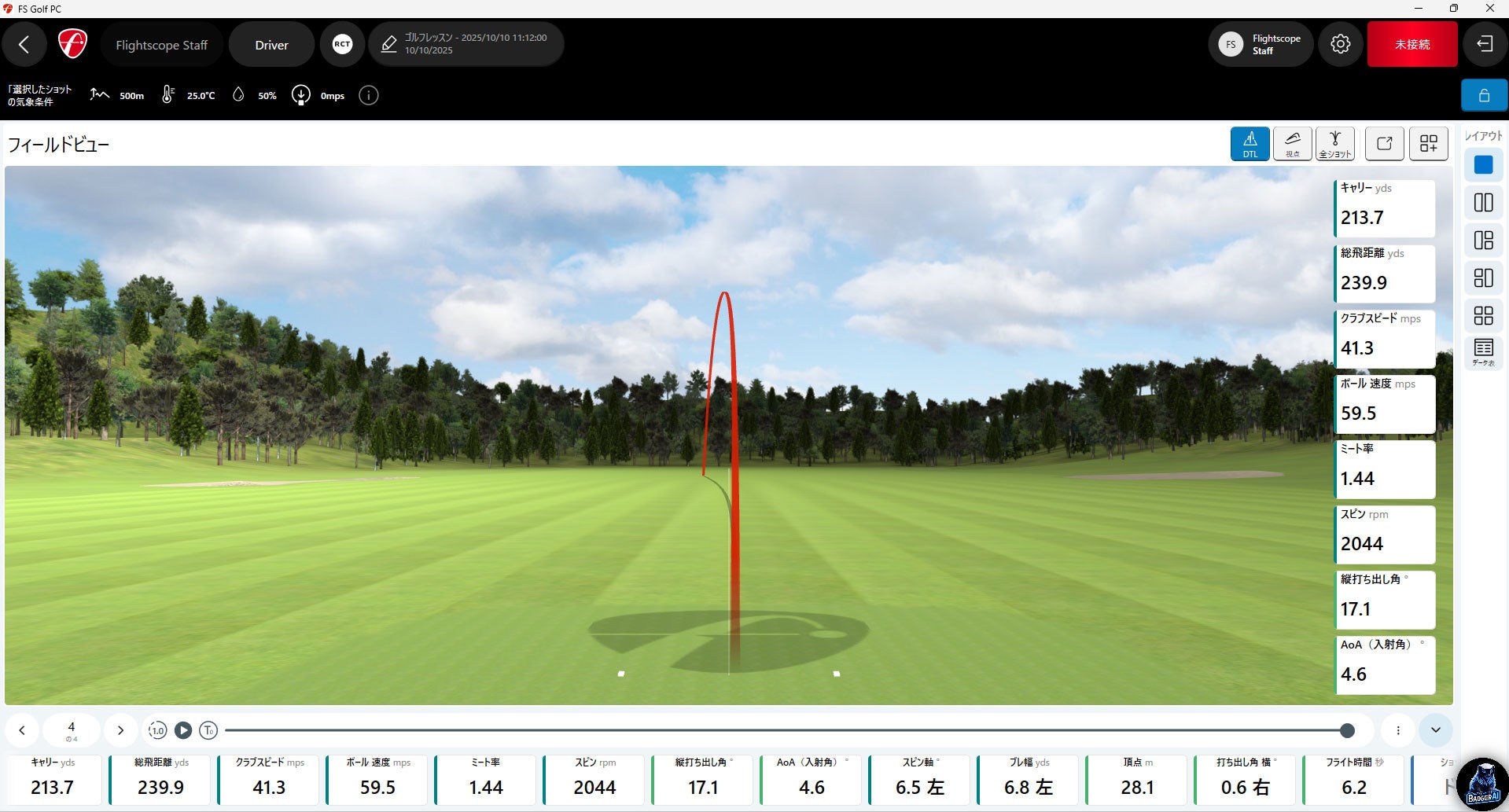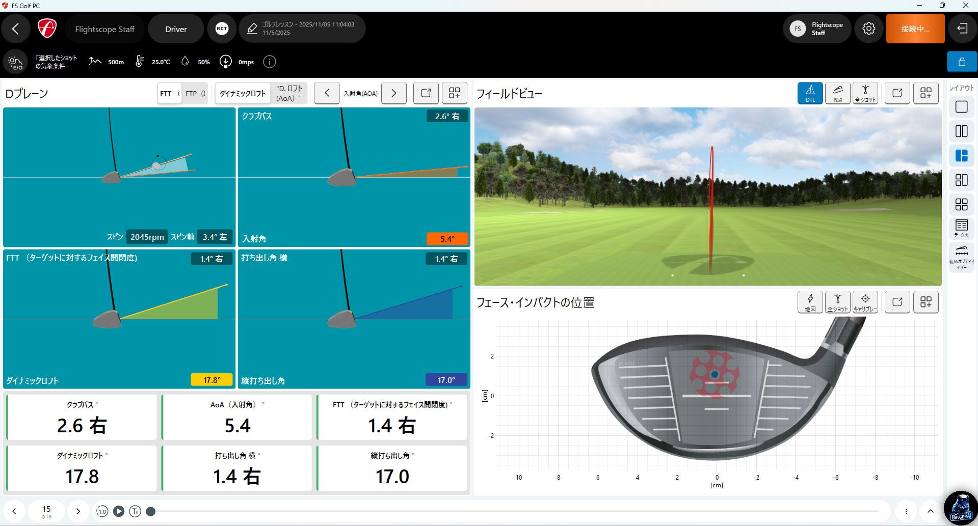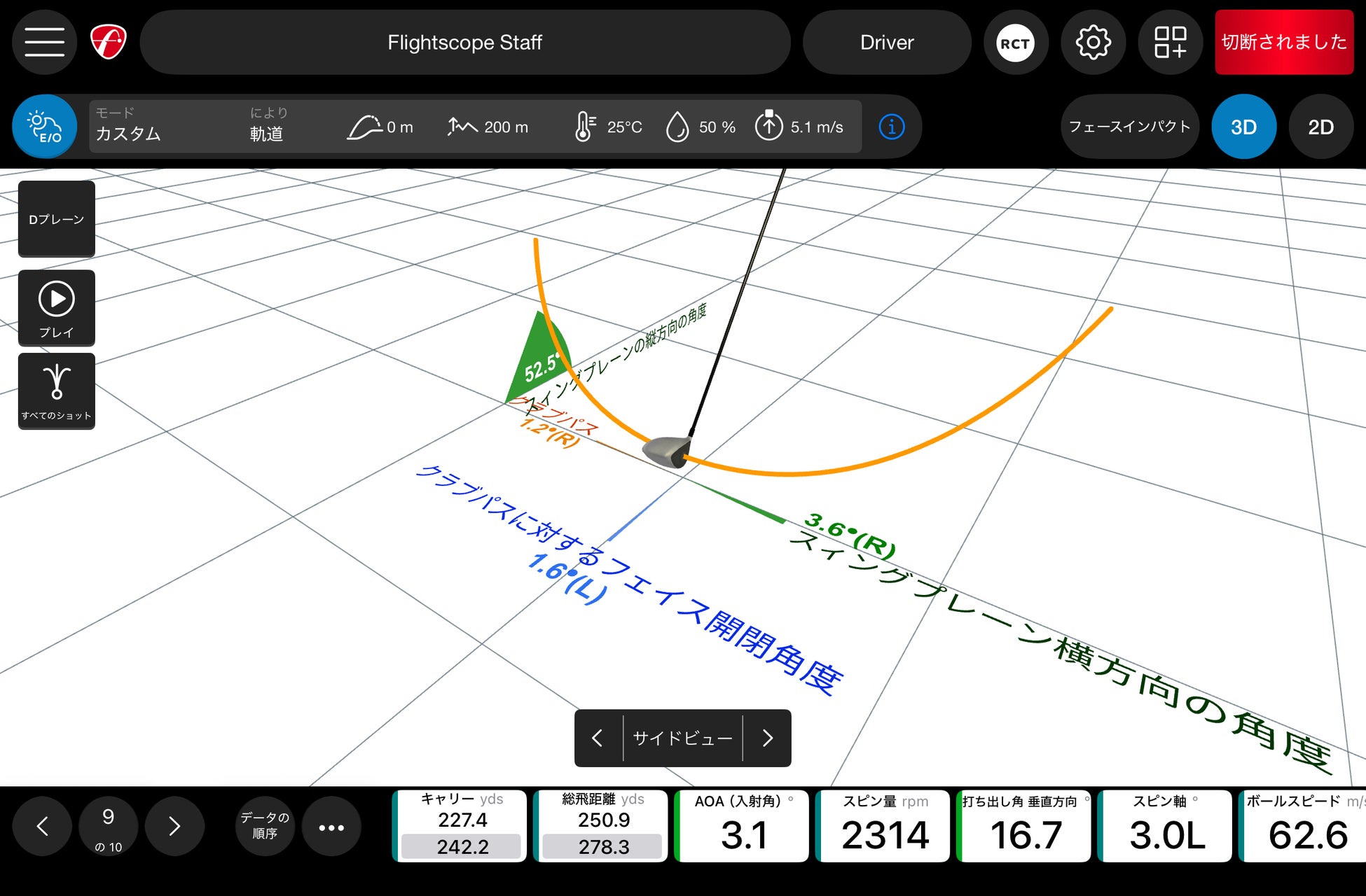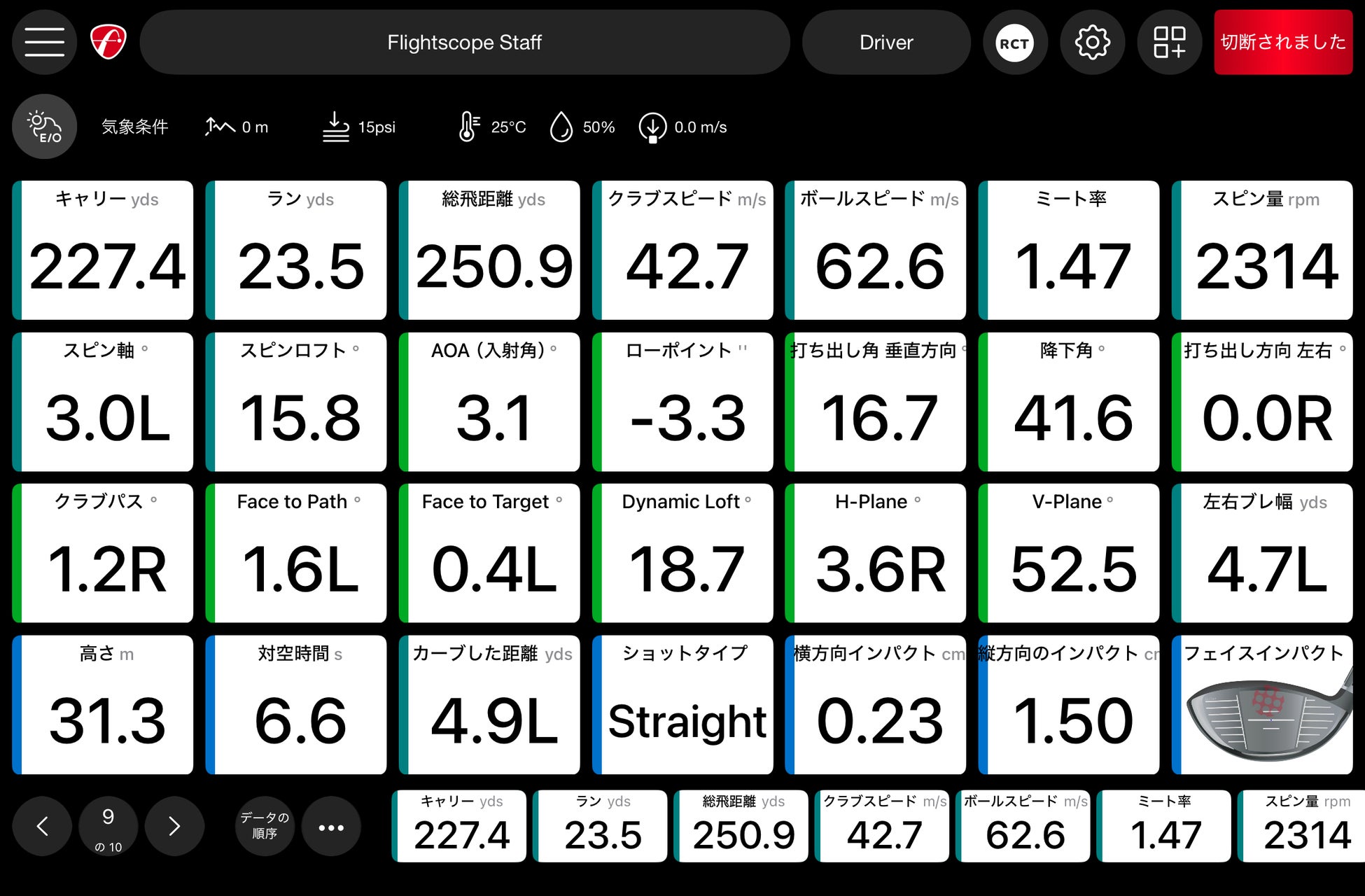 打ち出し角度や、スピン量、スマッシュファクターの指標を表示します。