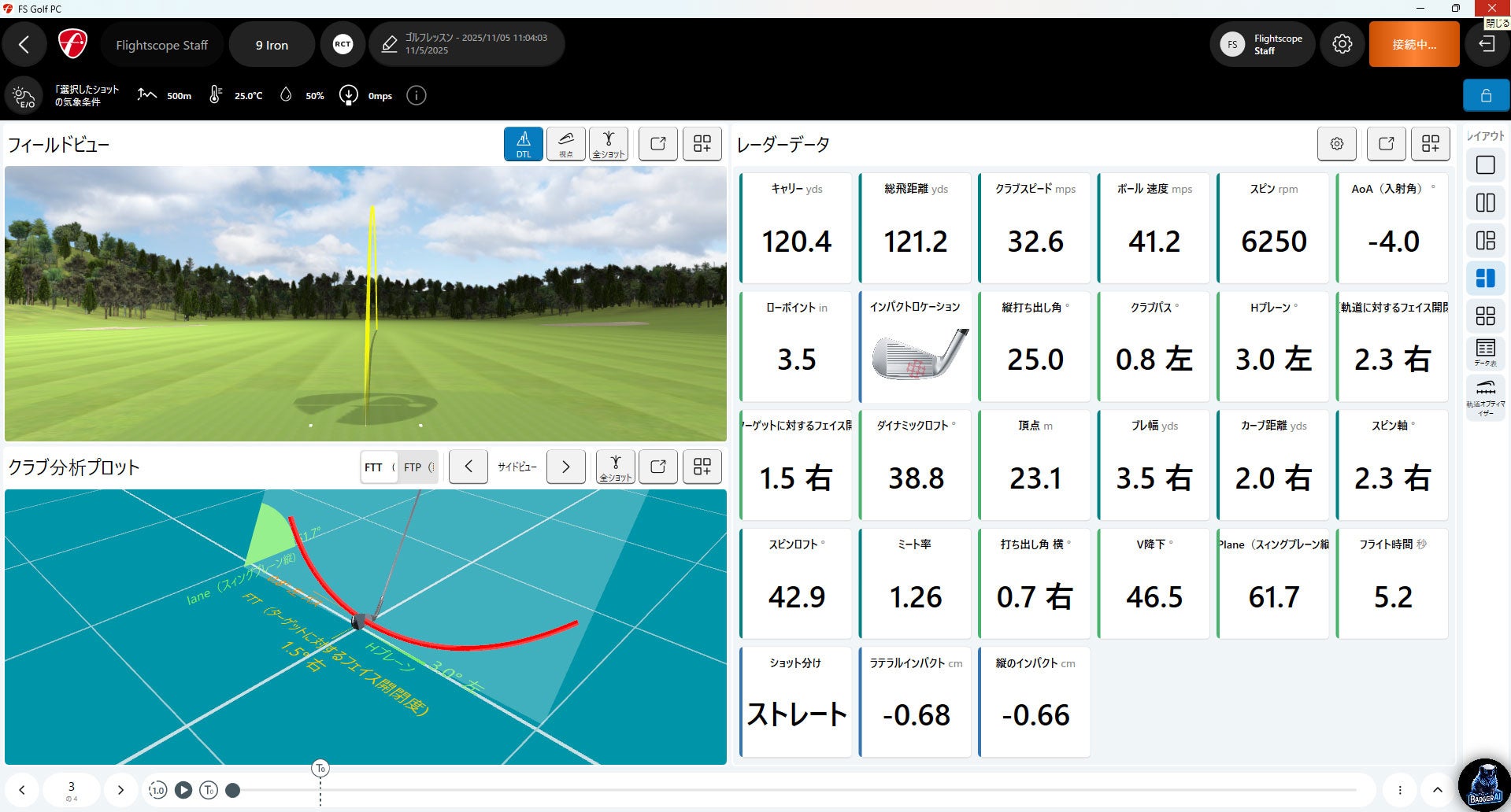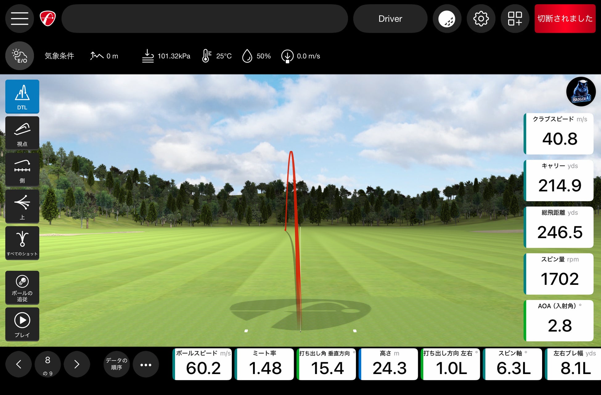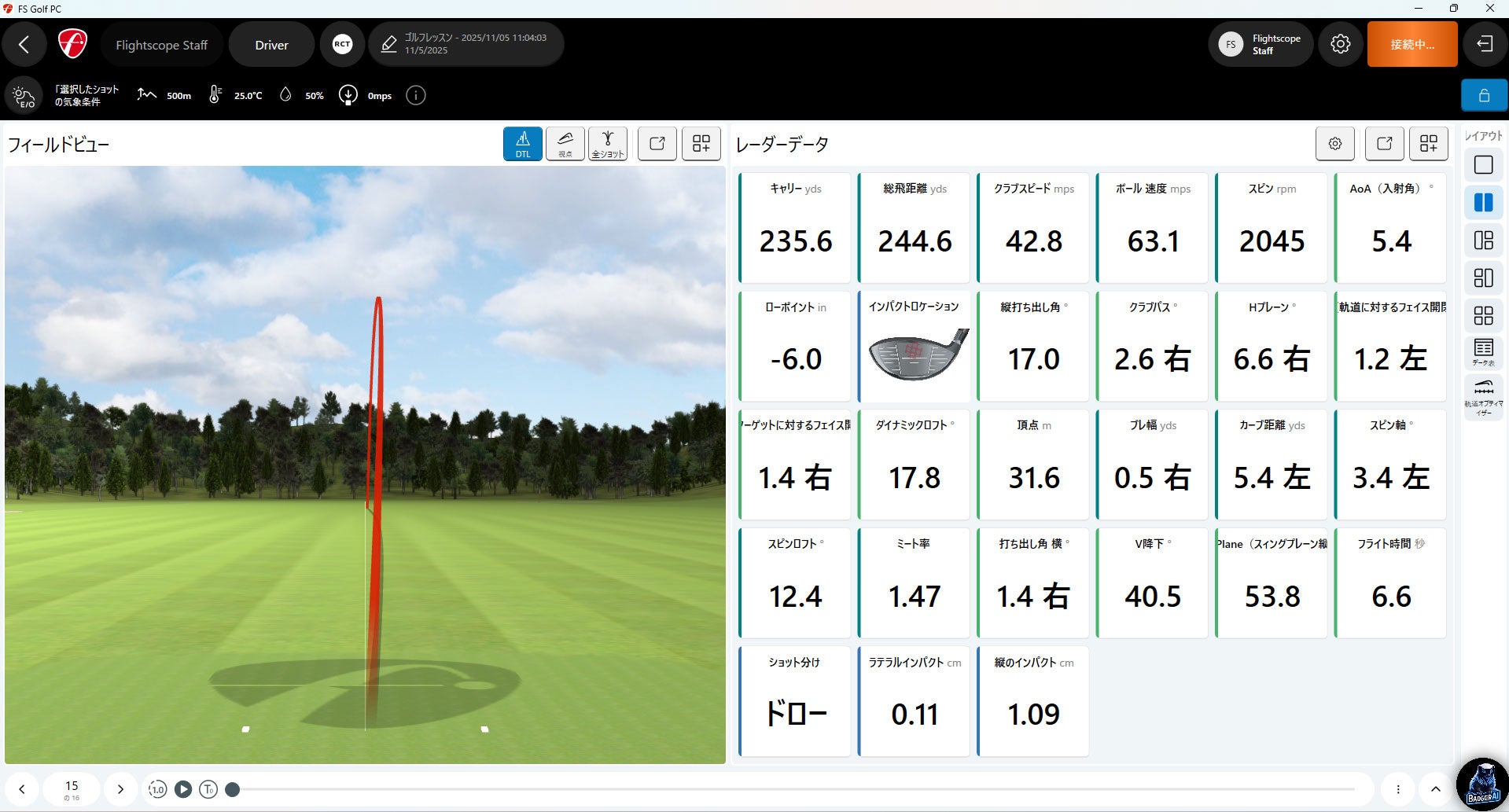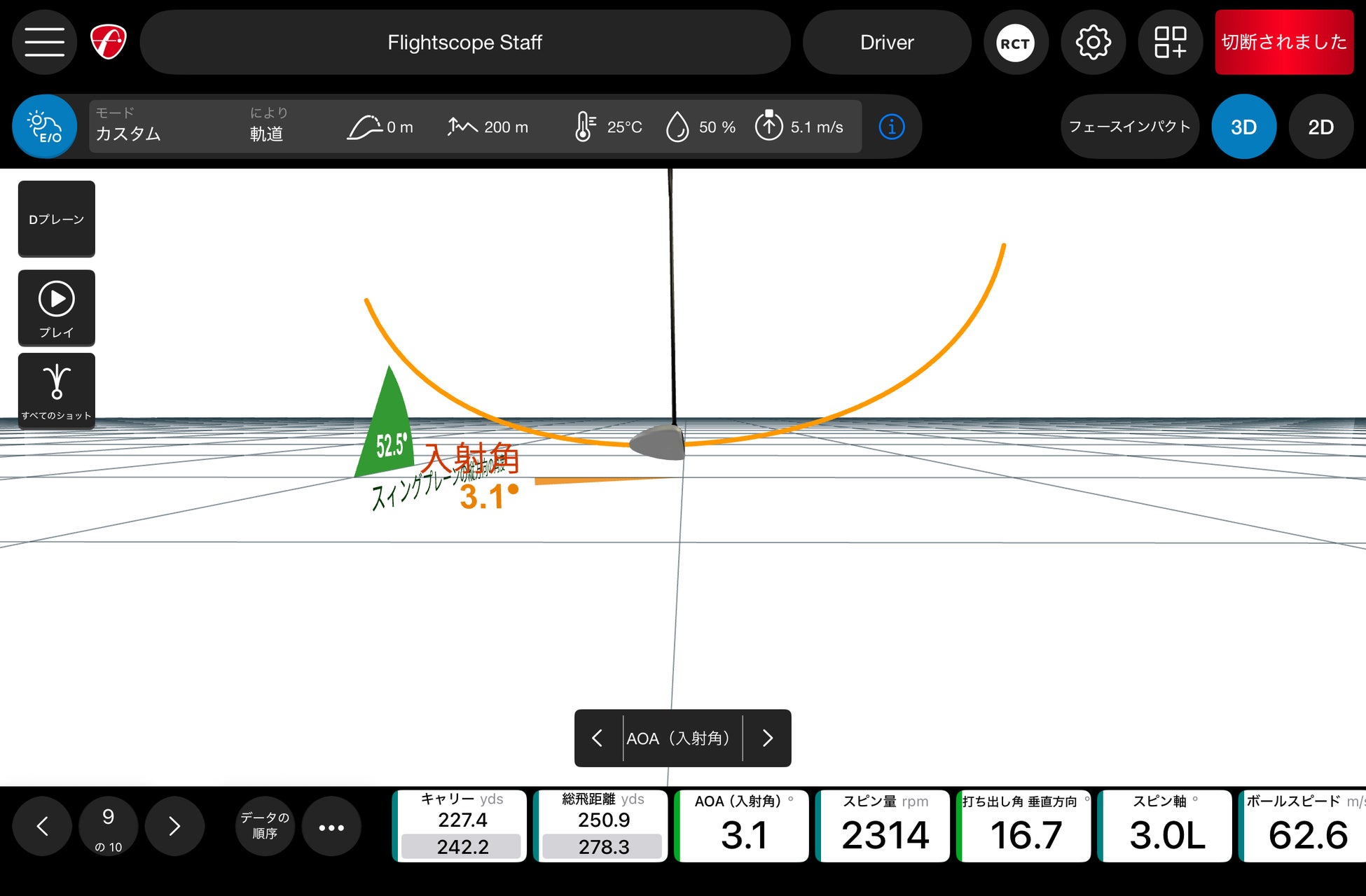 打ち出し角度や、スピン量、スマッシュファクターの指標を表示します。