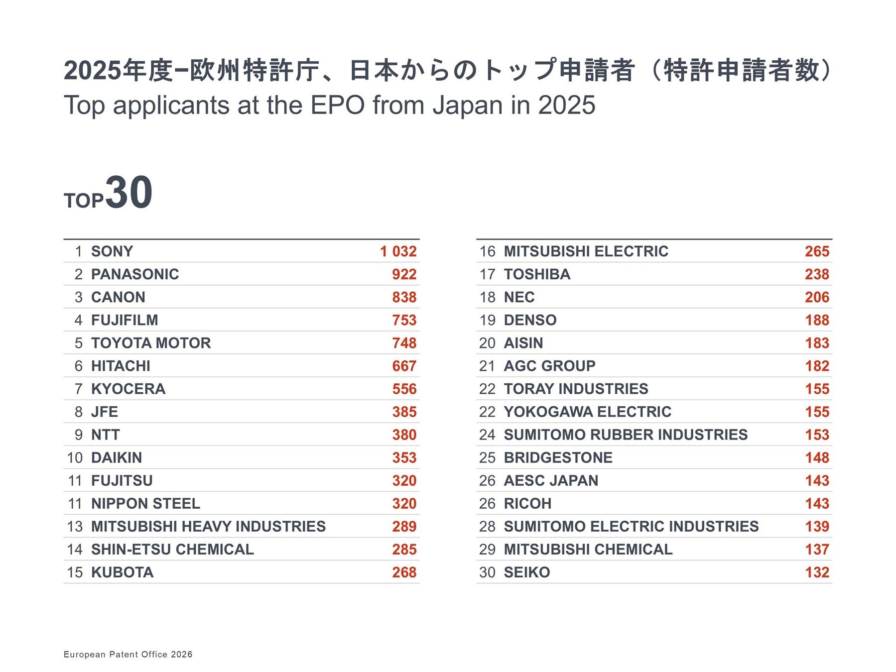 ソニー・パナソニック・キヤノンを筆頭に、グローバルなEPO出願上位企業に日本企業が複数ランクイン