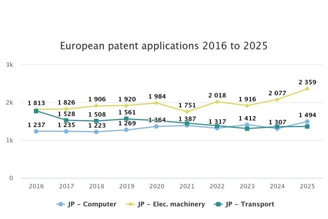 2025年における欧州への特許出願国の首位は米国(-1.6%)を維持し、ドイツ(-2.2%)、中国(+9.7%)、日本(+1.1%)、韓国(+9.5%)が続きました。日本は2025年に成長を記録した上位10カ国のうちわずか3カ国の一つであり、数年にわたる安定・低下傾向からの転換となりました。 中国が2016年以来の出願数を3倍に伸ばし、初めて日本を上回って第3位に浮上した一方、日本のイノベーターは幅広い戦略的技術分野にわたって特許出願件数を増加させました。