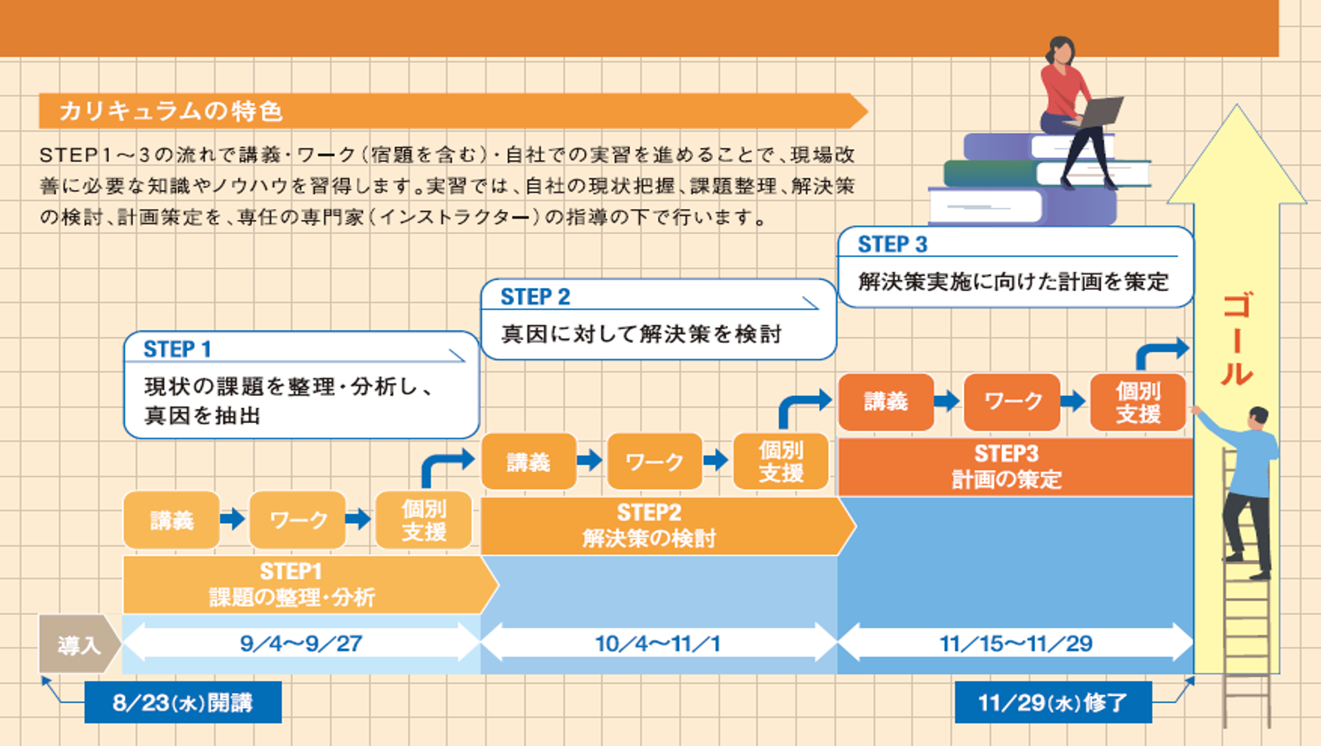 従業員に選ばれる企業、変化に強い企業になるために、すぐにでも実践できる生産性向上の手法やデジタルツールが身につき、企業成長に欠かせない改善計画の策定を支援