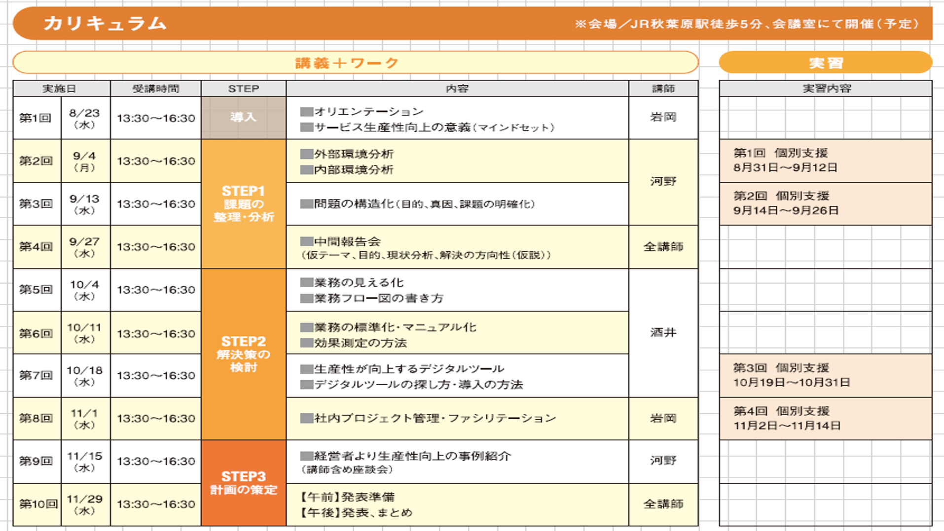 定員10社に対し、講師3人、インストラクター3人が徹底サポート。全10回の講義と4回の個別支援を通じて、自社がさらに成長するために改善すべき課題を抽出し、業務効率化に直結するデジタルツールや様々な解決策を学ぶことができます。