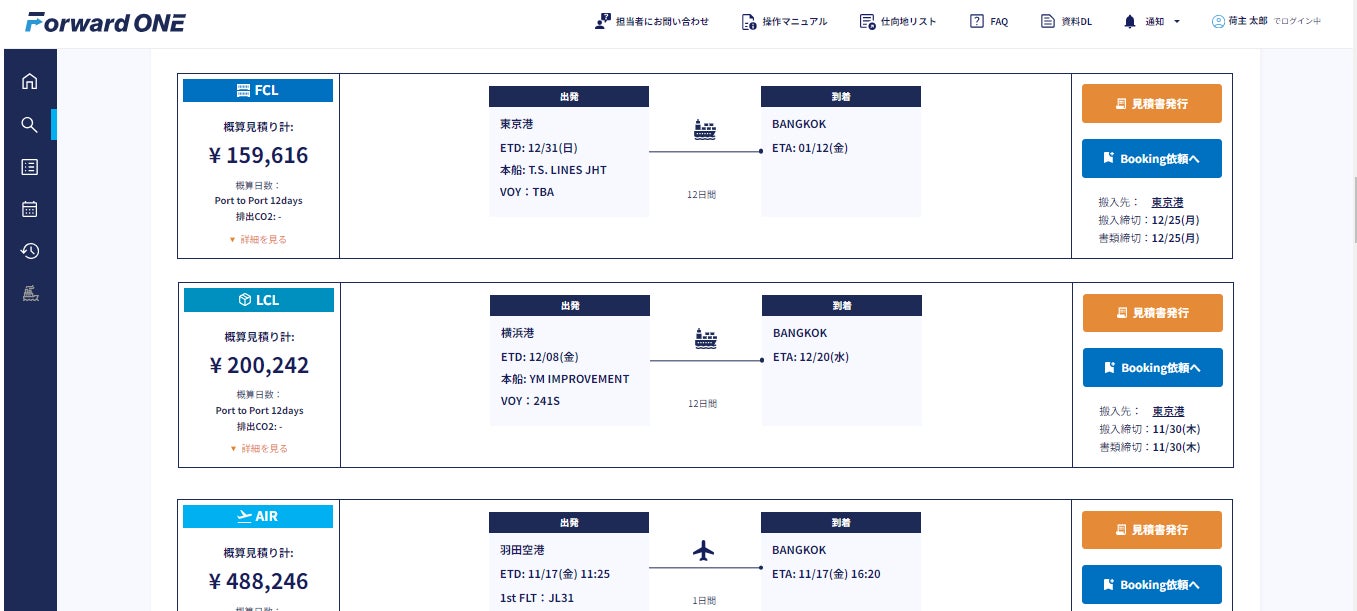 この度のサービス拡大に伴い、船便(FCL,LCL)、航空便の物流費と輸送スケジュールを一度にご確認いただけるようになった為、コスト・納期を比較しながら出荷計画を立てて頂くことが可能になりました。