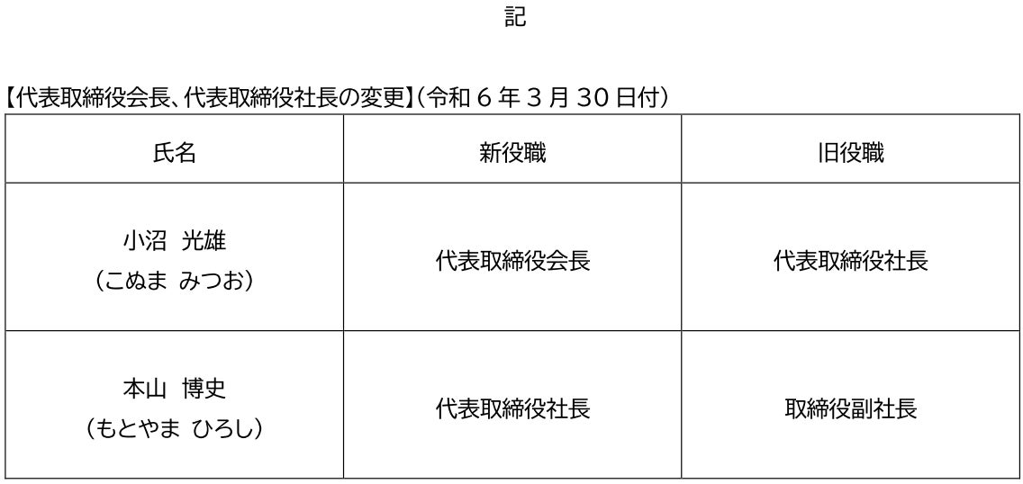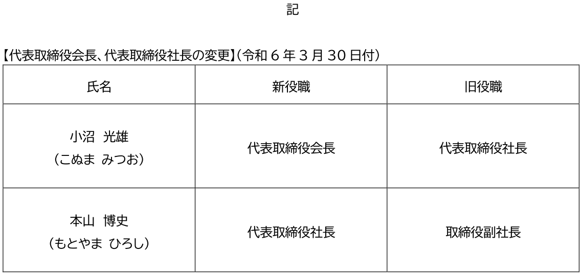株式会社アクティオホールディングス(本社:東京都中央区日本橋)は、令和6年3月30日開催の株主総会におきまして、取締役副社長 本山博史が代表取締役社長に就任いたしました。なお、これに伴い、代表取締役社長の小沼光雄は代表権のある会長に就任いたしました。また、それに伴い新役員体制、新組織体制を決定いたしましたので、お知らせいたします。