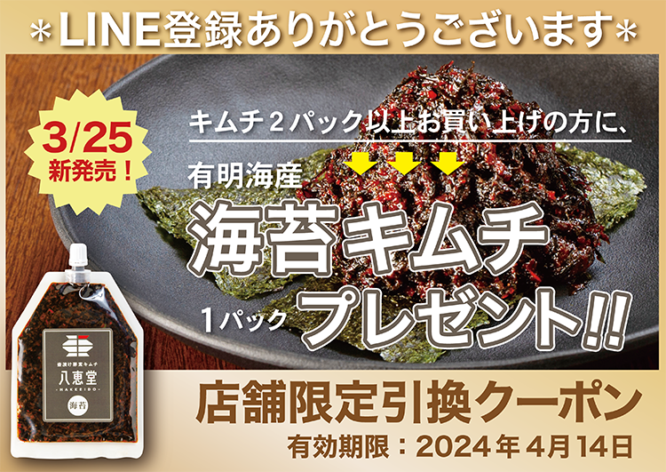八恵堂店舗「博多本店」「新宿マルイ店」で、2つ以上の商品をお買い上げの方に、数量限定で『海苔キムチ』をプレゼント!!
