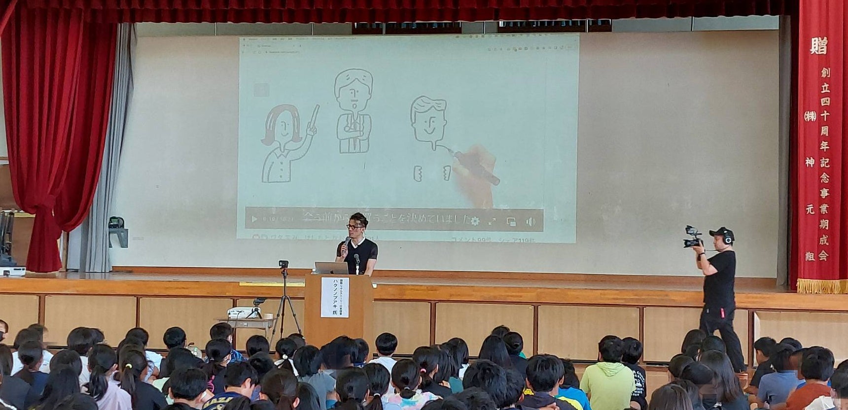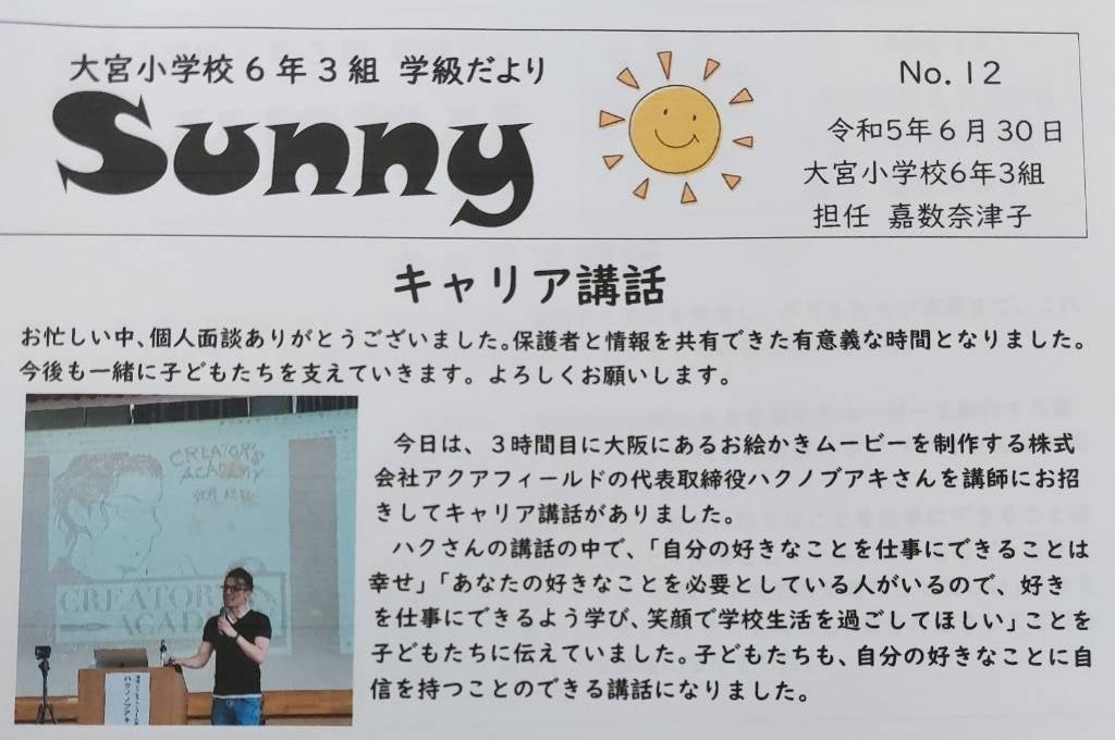 「ストーリー」と「手描き表現」で企業や起業家のブランディングや商品PRの悩みを解決する「お絵かきムービー」の提供と「お絵かきクリエイター」育成を行うクリエイターズアカデミー(運営:株式会社アクアフィールド及び一般社団法人国際じぶんストーリー協会:大阪府大阪市 代表 白 兆章[ハクノブアキ])は、今回、沖縄県名護市立大宮小学校でのキャリア講話にゲストとして登壇した。