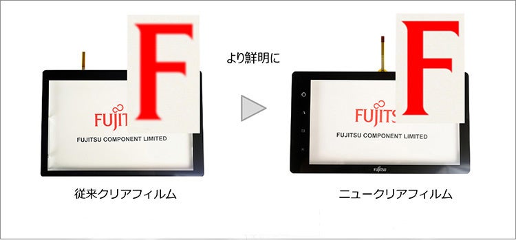 富士通コンポーネントが今般開発したニュークリアフィルムは、抵抗膜式タッチパネルの写像性(画像明瞭度)や操作性を大きく向上させるフィルムです。