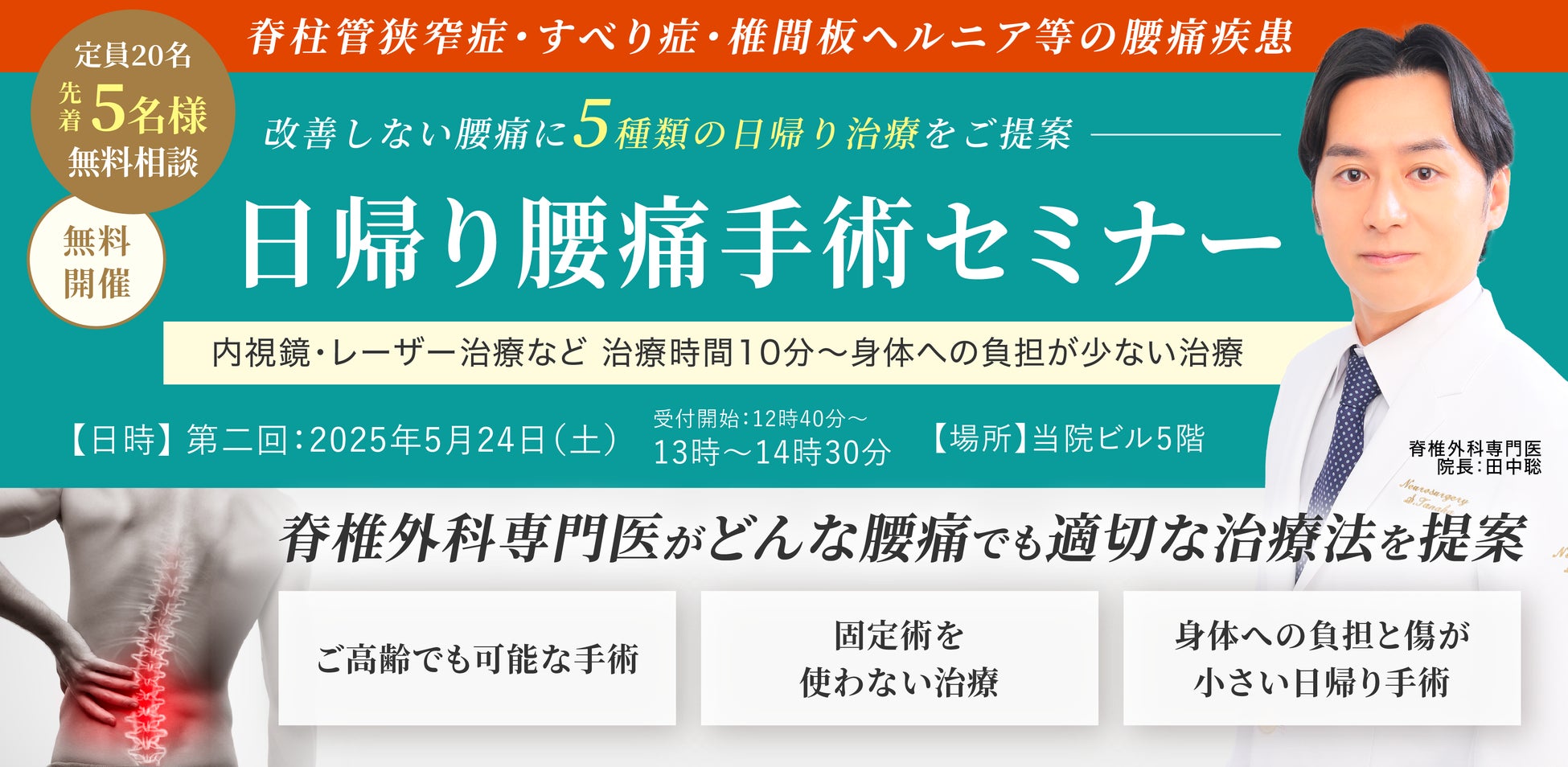 今回のセミナーでは、脊椎外科専門医が最新の低侵襲手術について脊椎外専門医である当クリニックの田中院長が、「ボルトを入れたくない」「入院は難しい」「症状が改善せず困っている」という方に、新たな一歩となる内容をお届けします。