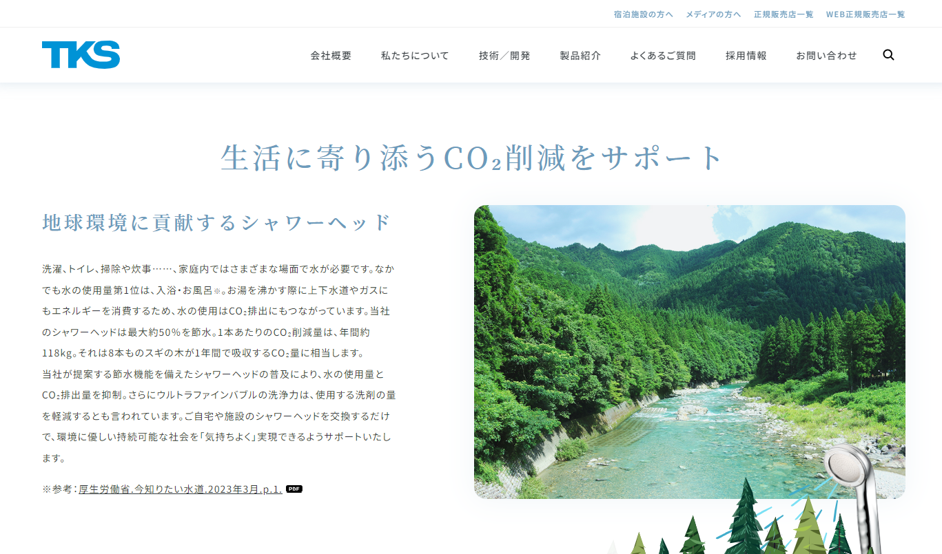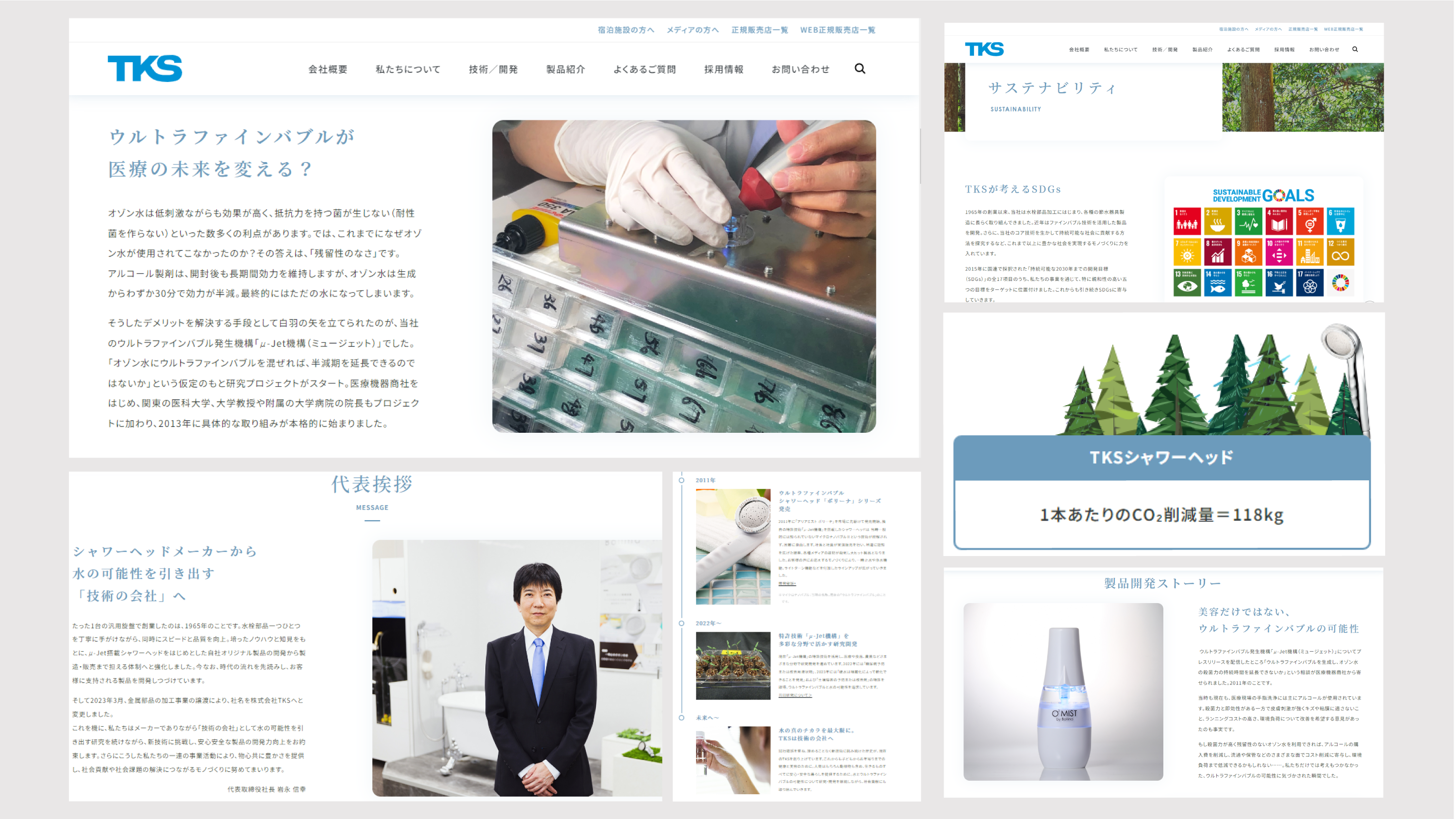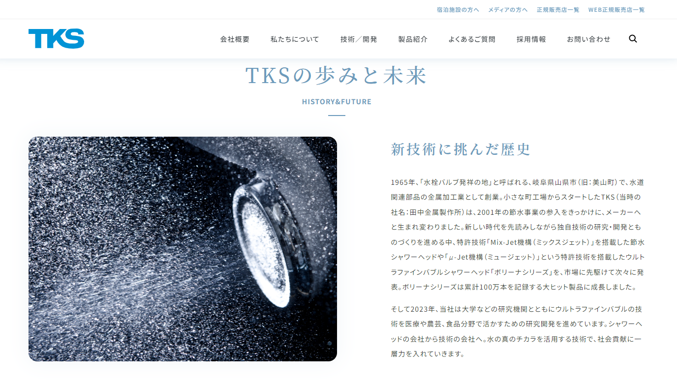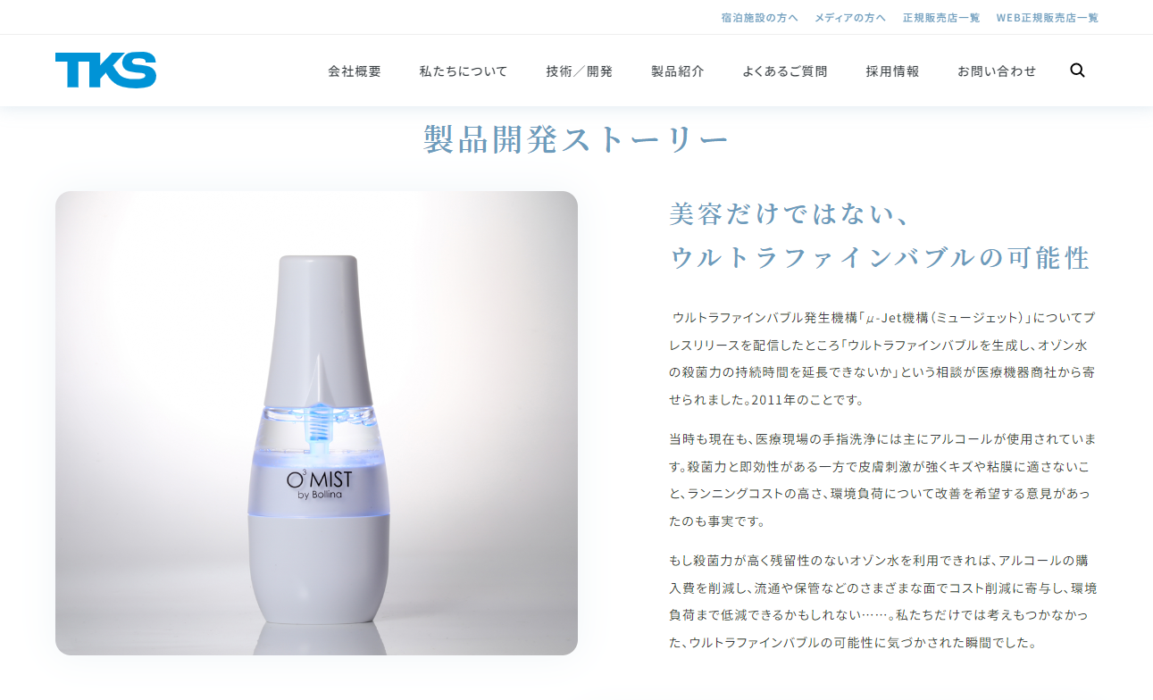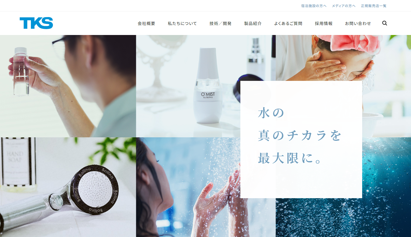 「技術の会社、TKS。TKSの強みは、イノベーションと歴史にあります。赤ちゃんからご高齢の方までの健康と美容のために。人間はもちろん動植物も含め、生きるものすべてに安心・安全な暮らしを提供するために。水とウルトラファインバブルの可能性について研究・開発するとともに、すべての人にちょうどいいものづくりに真摯に取り組んでいます。」