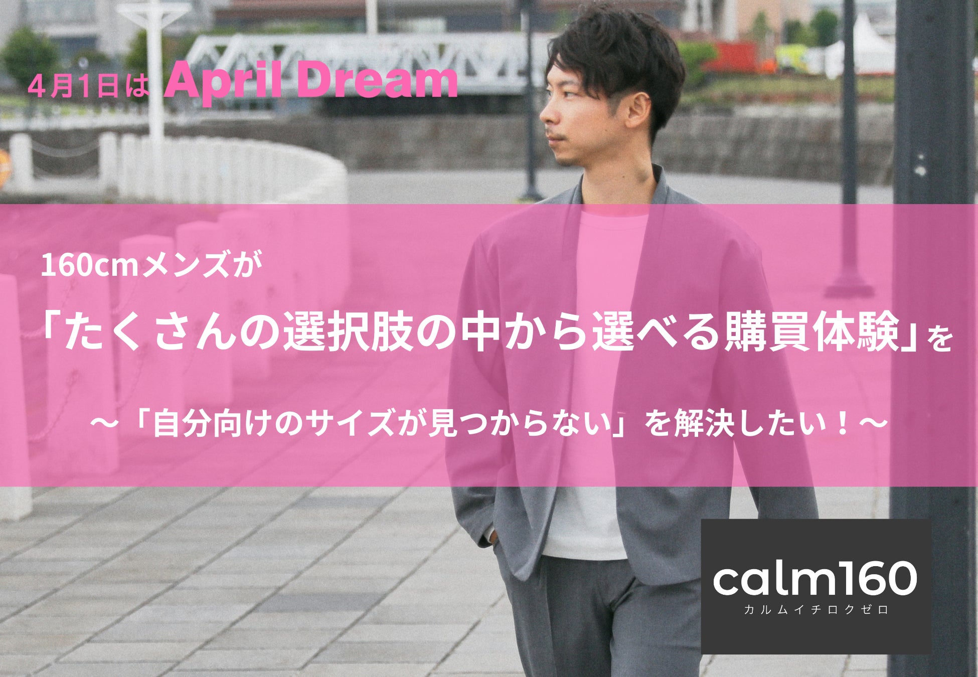 株式会社ファイブミーターズ(所在地:福岡県福岡市、代表取締役:稲田美紀)は、4月1日を夢を発信する日にしようとするApril Dreamに賛同しています。このプレスリリースは身長160cm前後男性のためのファションブランド「calm160」の夢です。