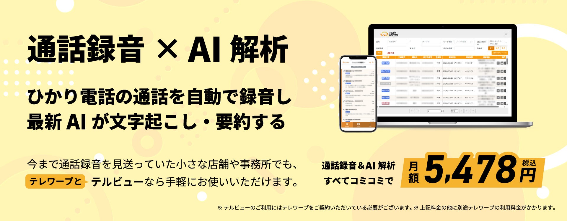 「テルビュー」は、テレワープを介してスマホで会話した固定電話番号の通話を自動で録音・クラウド保存し、AIが高精度にテキスト化・要約を行うサービスです。
