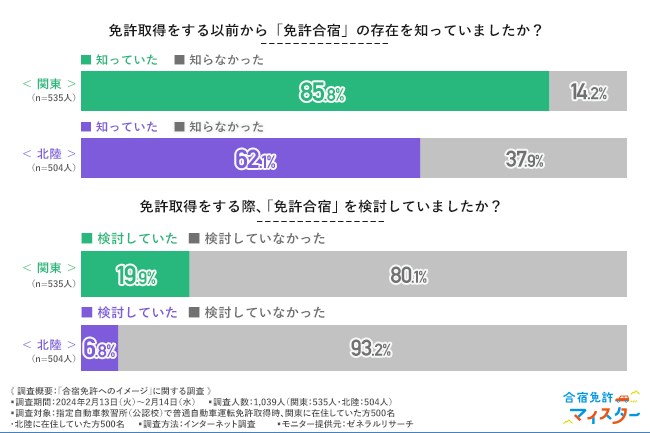 北陸では合宿免許の存在自体を知らなかった方の比率が関東の倍以上(関東:14.2%、北陸:37.9%)ということが示されました。