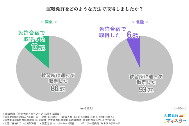 関東では合宿で免許を取得した方の比率は北陸の約2倍(関東:13.5%、北陸:6.8%)であることが明らかになりました。