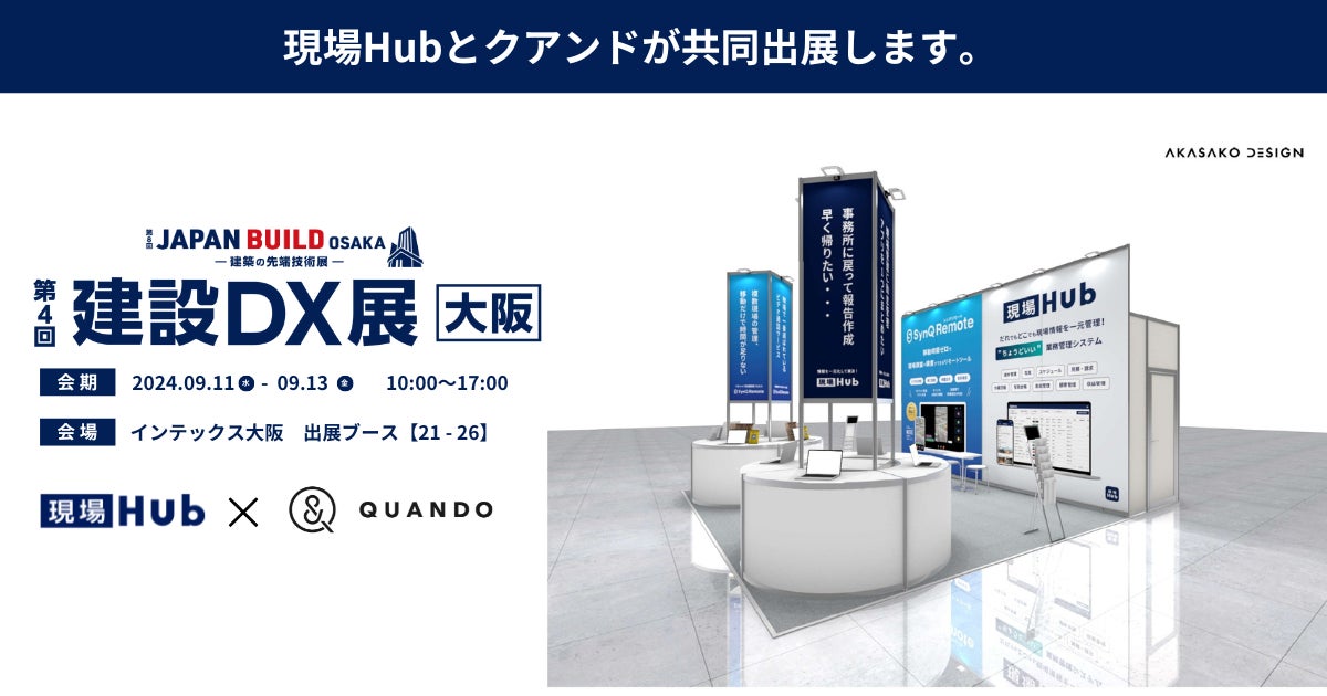 工事・メンテナンス会社に特化した業務管理システム『現場Hub』を運営する現場Hub株式会社(東京都渋谷区、代表取締役CEO:岡田光正)は、株式会社クアンド(本社:福岡県北九州市、代表取締役CEO:下岡 純一郎)と共に、2024年9月11日(水)〜13日(金)にインテックス大阪で開催される『第4回建設DX展』 (JAPAN BUILD OSAKA内)に出展することをお知らせいたします。