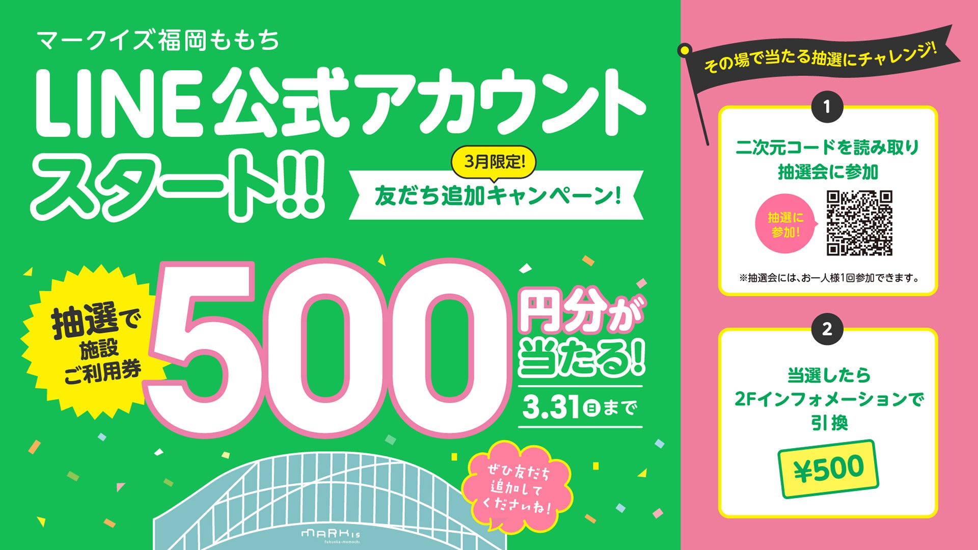 3月12日(火)より、MARK IS 福岡ももちのLINE公式アカウントがスタート!スタートを記念して3月31日(日)までの期間中、施設内にあるキャンペーンステッカー記載の「二次元コード」をスマホで読み込むと、抽選で500円分の施設ご利用券が当たるキャンペーンに参加できます。