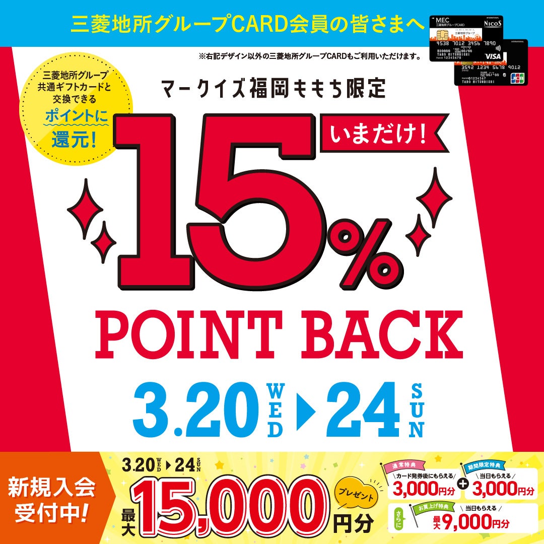 期間中、MARK IS 福岡ももちで三菱地所グループCARDをご利用いただくと、100円(税込)ごとに三菱地所グループポイントを15%還元します。たまったポイントは1,000ポイントごとに三菱地所グループ共通ギフトカード1,000円分と交換が可能。年に数回だけのお得な5日間です。