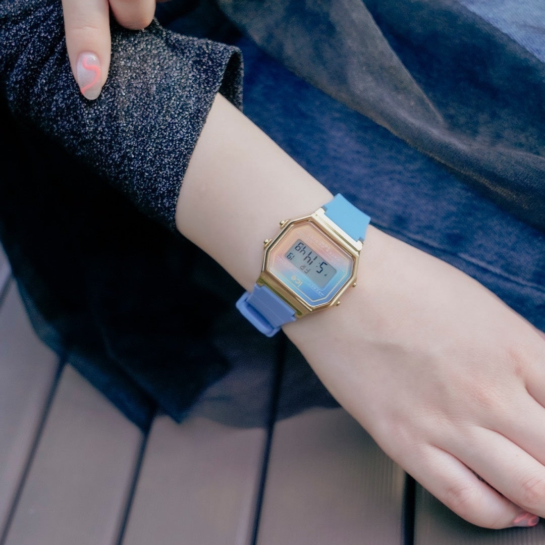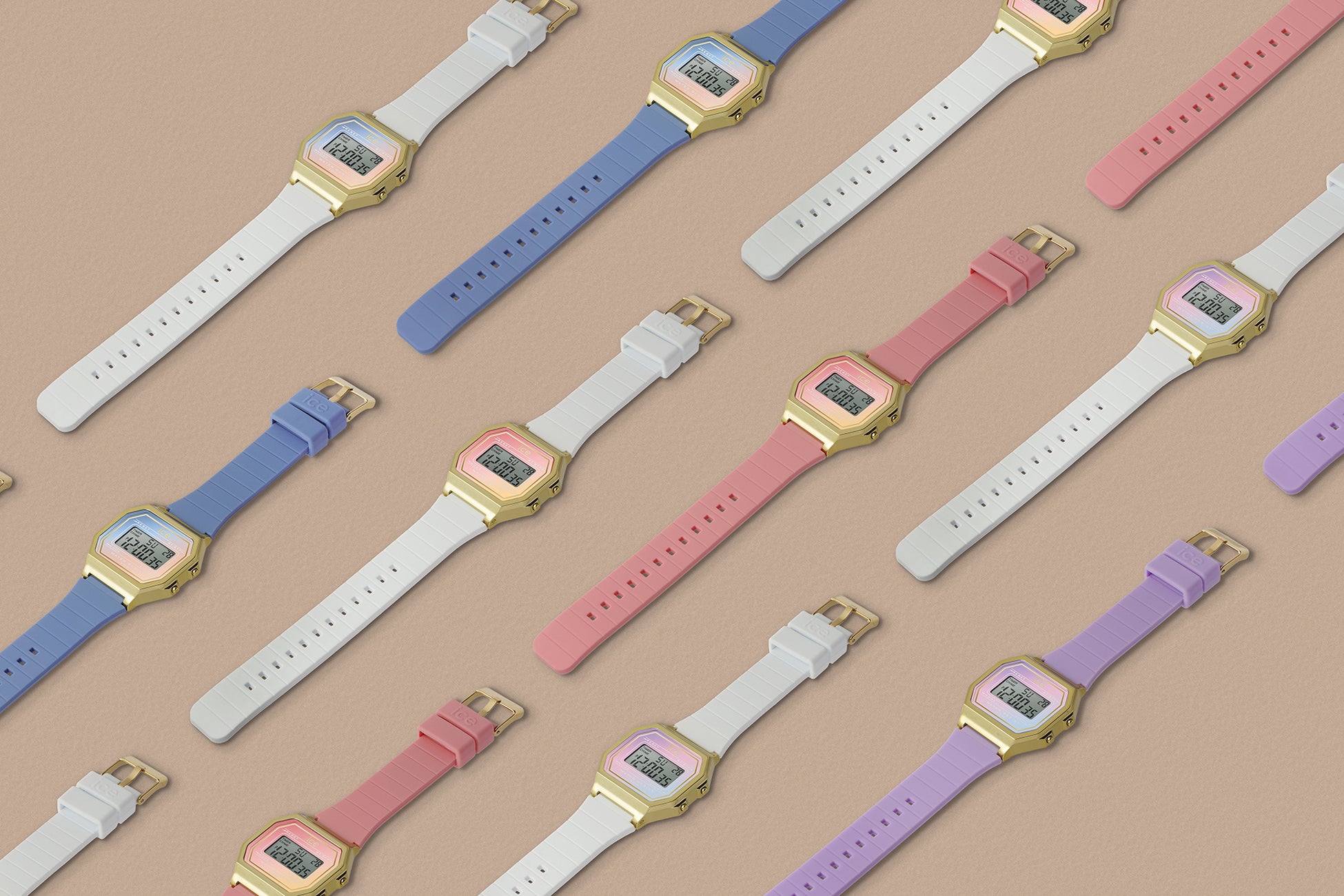 今回発売されるのは、その「デジットレトロ」の文字盤を春らしい柔らかな色味のピンクやブルー、パープルのグラデーションで施した全6種類のモデル。フェイスカラーは3種類で、それぞれのカラーに合わせた単色のストラップを備えたモデルと、文字盤のカラーがより際立つホワイトのストラップを組み合わせたモデルの計6種類をラインナップする。