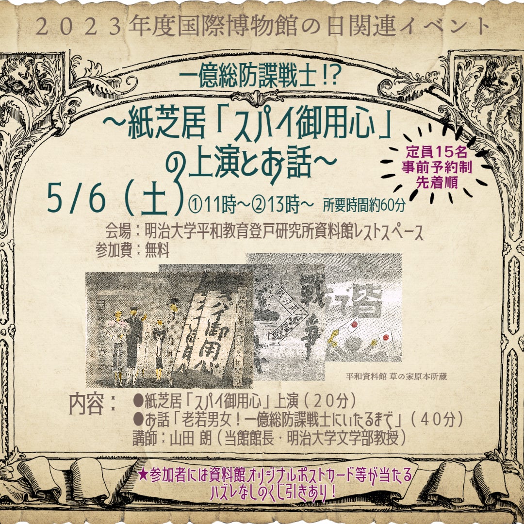 URL | 国際博物館の日(5月18日)記念事業について https://www.meiji.ac.jp/noborito/info/2022/mkmht0000007y6ko.html 国際博物館の日 記念事業「一億総防諜戦士!?~紙芝居『スパイ御用心』の上演とお話~」のお知らせ |