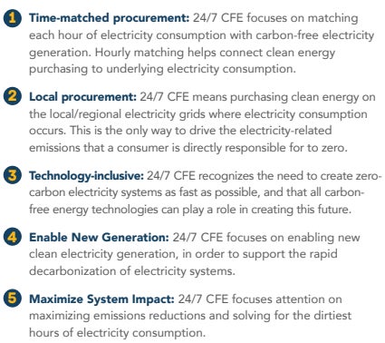 24/7 CFE Compactは、24時間365日、100%リアルタイムの再エネ電力需給の実現に向けて、以下のように、加盟企業に5つの基本方針を提示しています。