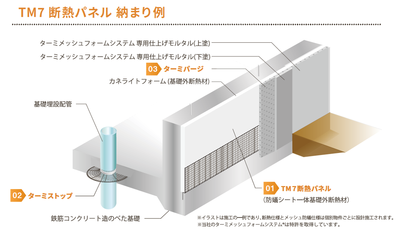 ターミメッシュフォームシステムは、基礎外に施工された断熱材にステンレスメッシュを覆うことで、シロアリ侵入を防ぐ物理的防蟻工法です。薬剤を使用した防蟻工法とは違い、薬効切れの心配がなく、長期間に渡り、安心して防蟻性を期待できる工法です。
