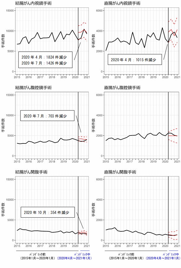 厚生労働省から2015年1月~2021年1月のNDBのサンプリングデータセット(年4回作成:1、4、7、10月)の提供を受けました。各大腸がんの治療について、各月の診療報酬明細書(レセプト)(注3)の件数をカウントし、時系列分析(注4)という手法を用いて、パンデミック前の件数の推移から、パンデミック後の件数を予測するとともに(パンデミックがなかったと仮定した場合の件数の予測値)、パンデミック後の件数の変化量を推定しました。