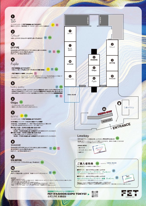 参加条件:FET(FASHION EXPO TOKYO)のLINEお友だち追加とInstagramをフォローし、会場で画面をご提示でどなたでもご参加可能です。